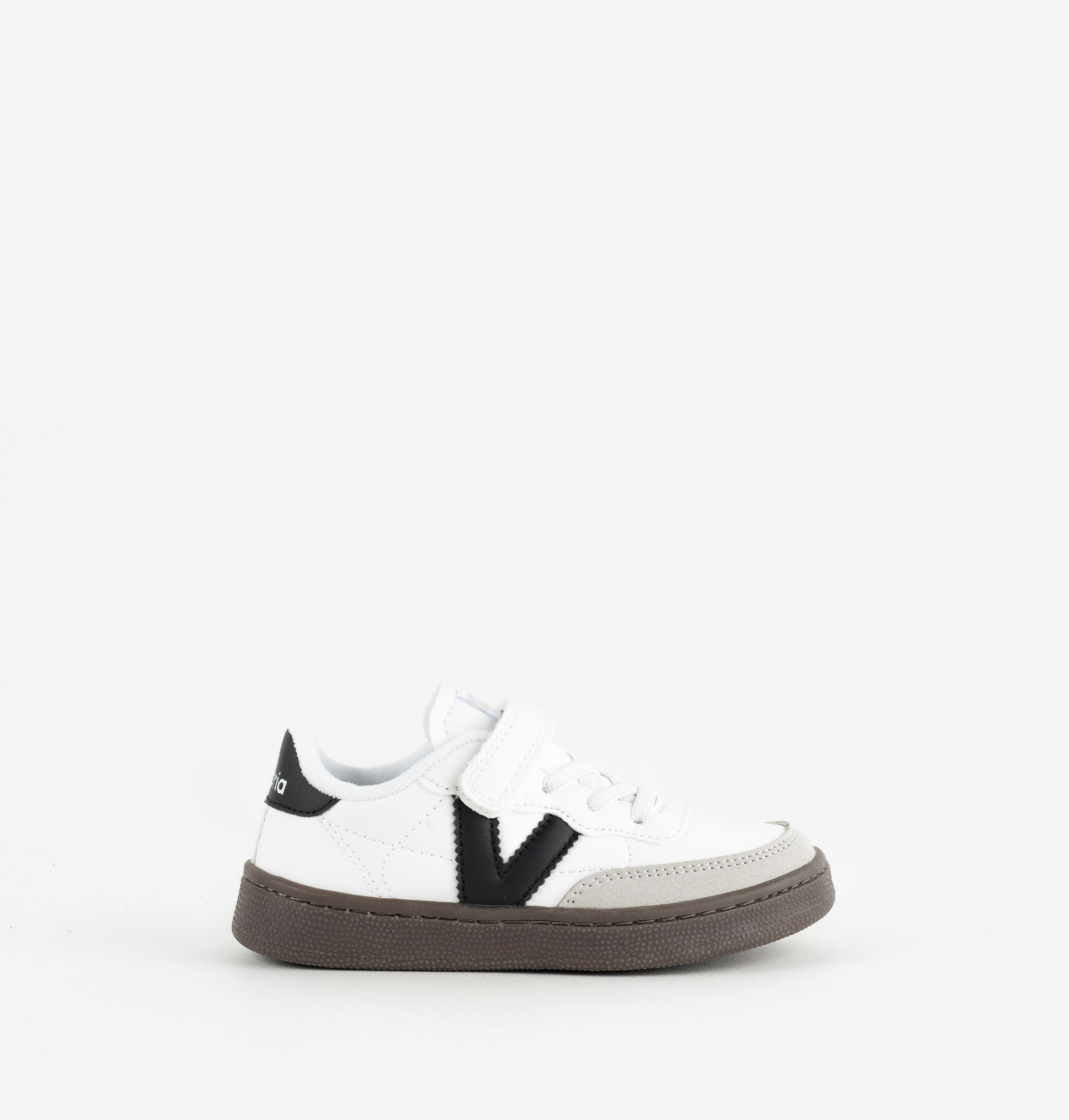 Zapatillas deportivas para niños fabricadas en efecto piel con puntera de efecto serraje. V de victoria lateral y pieza trasera con el logotipo de la marca grabado en contraste. Cierre mediante cordón elástico, que se acompaña de una tira adherente para facilitar el calce y aportar sujección, fomentando su autonomía. Cómoda suela de TPR en color marrón chocolate.