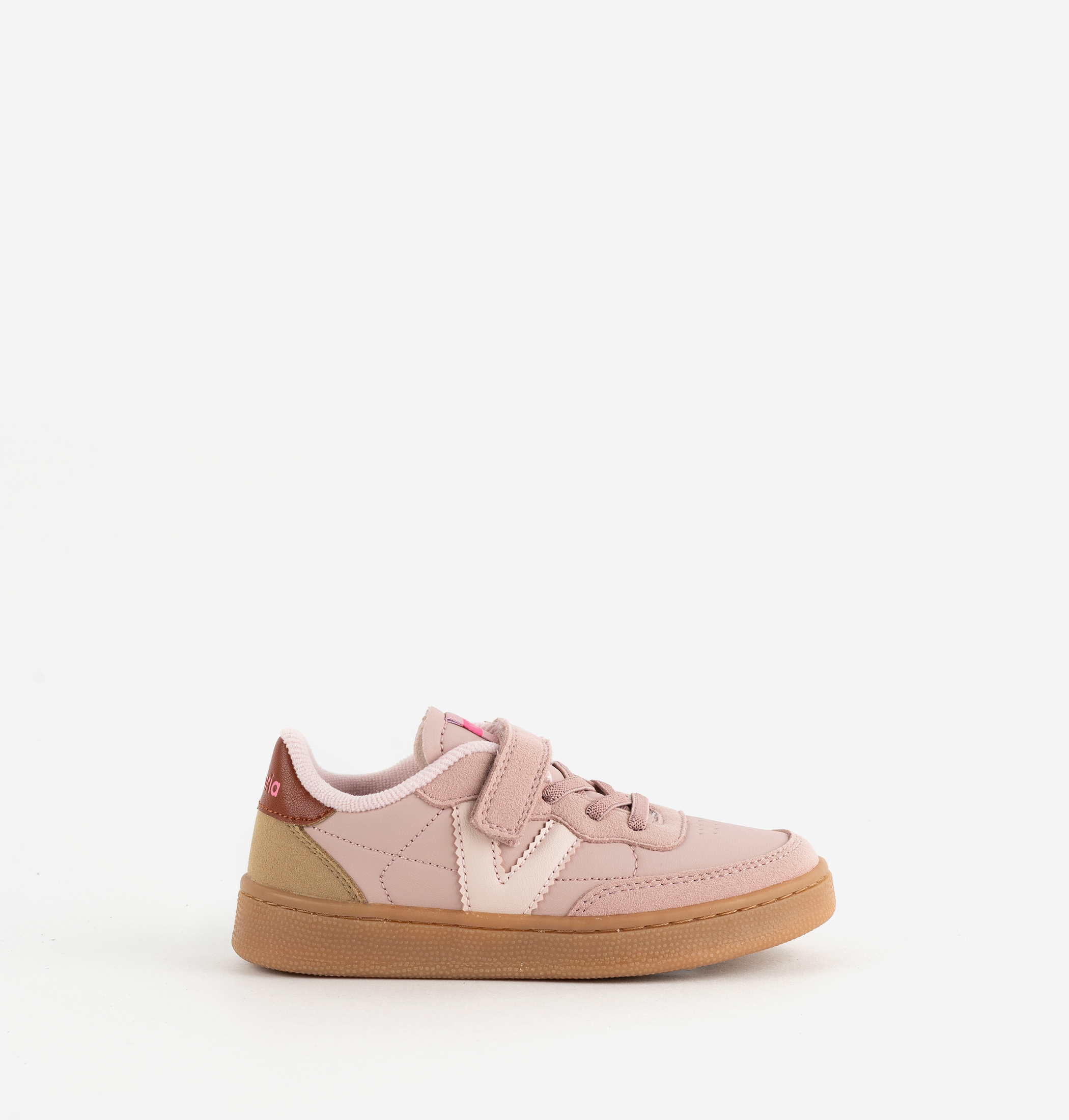 Zapatillas deportivas para niños fabricadas en material efecto piel y piezas de efecto serraje al tono, para un estilo duradero y moderno. Detalle de color en la V del lateral y en la pieza trasera. Cierre mediante cordones elásticos al tono y una tira adhesiva para un ajuste cómodo y fácil de poner. La suela en color caramelo añade un toque único completando el diseño juvenil y versátil de estas zapatillas.