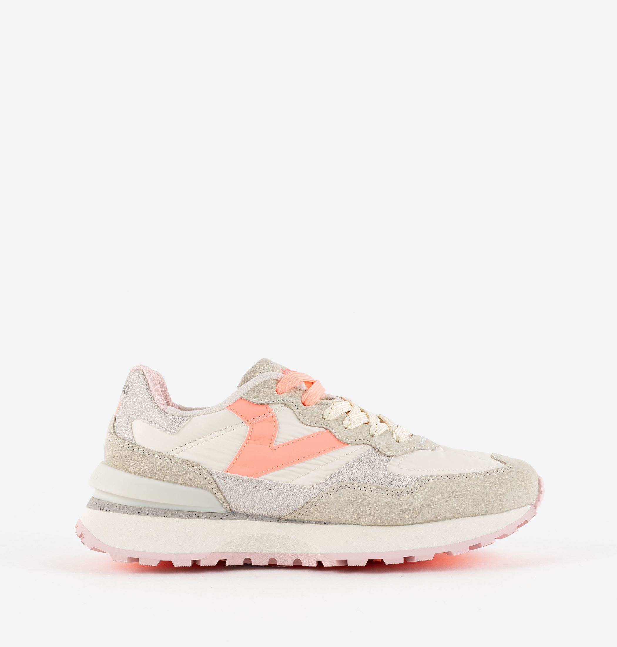 Sneakers para mujer fabricadas en nylon fino "soft touch" con piezas superpuestas en serraje acabado "velour" y microfibra metalizada. V retro de victoria lateral en PU "NEON". Cierre mediante cordones bicolor. Suela de EVA bicolor con patín dentado de goma a juego y estabilizador en el talón. Incluyen además una plantilla ergonómica que se adapta a la forma del pie y regala la sensación de comodidad.
