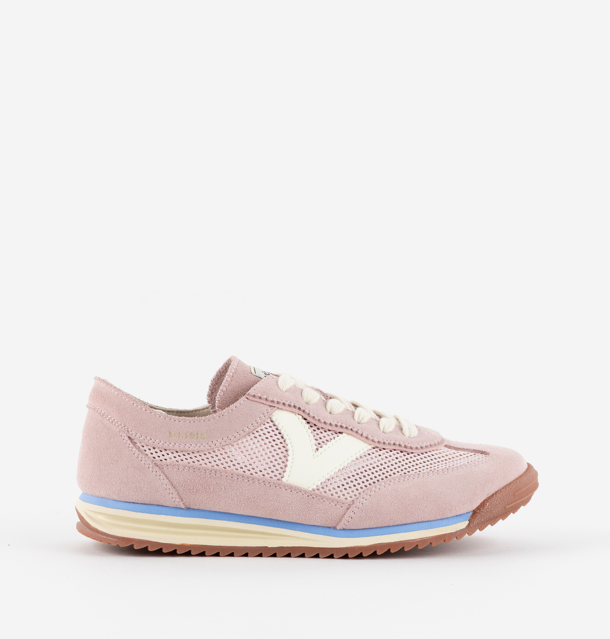 Sneakers unisex fabricadas en tejido tipo malla con piezas superpuestas de serraje al tono. V de victoria lateral en efecto piel blanca, que hace contraste junto con los cordones. Suela bicolor de goma con patín dentado de EVA en color caramelo.
