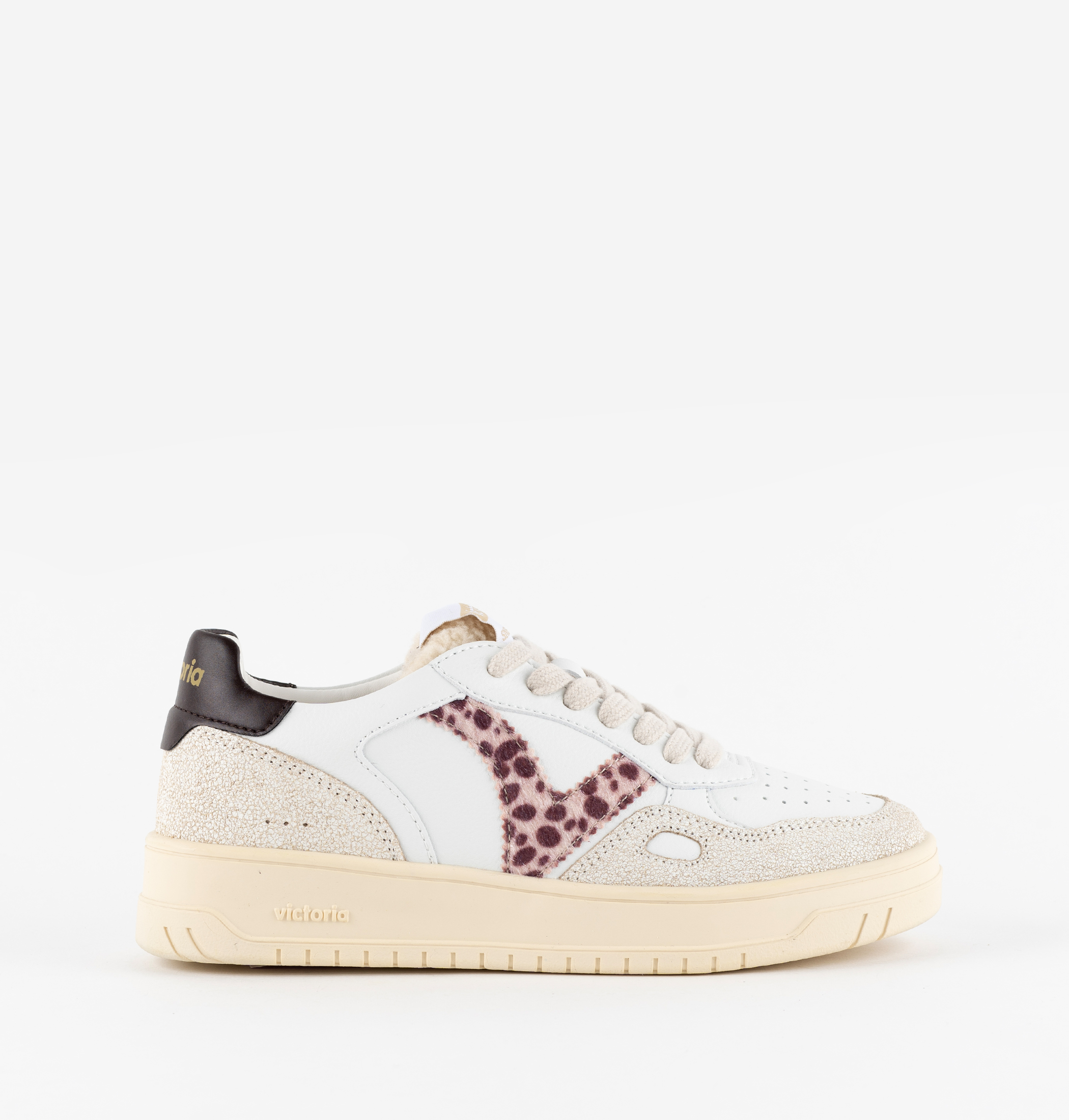 Zapatillas deportivas para mujer fabricadas en efecto piel blanca con piezas fantasía y de serraje. V de victoria lateral en animal print y detalle de color en pieza trasera con el logotipo de la marca grabado. Borreguito en la lengüeta y detalle en forma de ventana en el lateral. Puntera perforada para favorecer la transpiración. Suela de TPR ligeramente tostada.