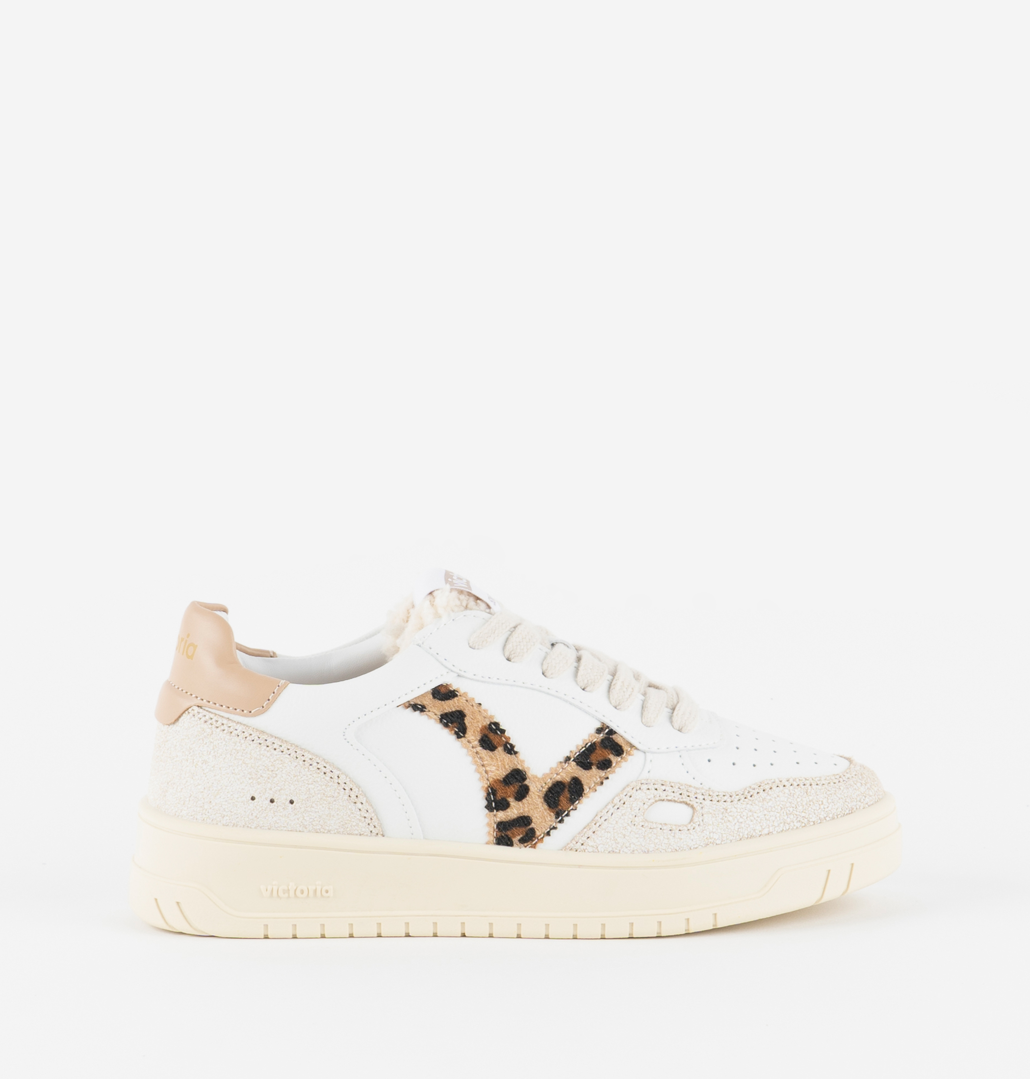 Zapatillas deportivas para mujer fabricadas en efecto piel blanca con piezas fantasía y de serraje. V de victoria lateral en animal print y detalle de color en pieza trasera con el logotipo de la marca grabado. Borreguito en la lengüeta y detalle en forma de ventana en el lateral. Puntera perforada para favorecer la transpiración. Suela de TPR ligeramente tostada.