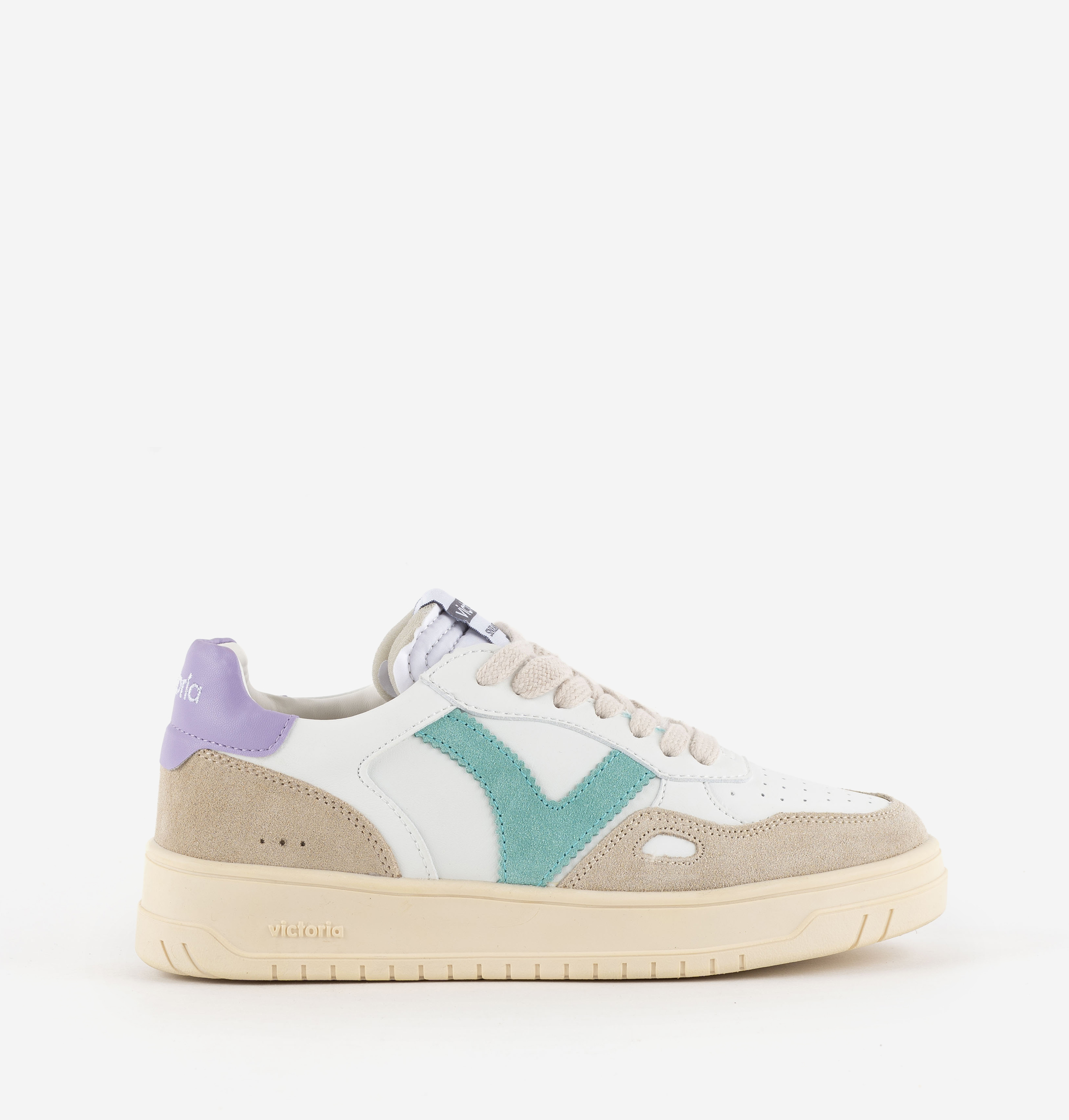 Zapatillas deportivas blancas unisex fabricadas en material efecto piel y piezas de serraje. Detalles de color en la V del lateral y en la pieza trasera con el logotipo de la marca. Detalle en forma de ventana en el lateral. Suela ligeramente tostada de 3,5 cm. Incluyen una plantilla extraíble acolchada para mayor confort.