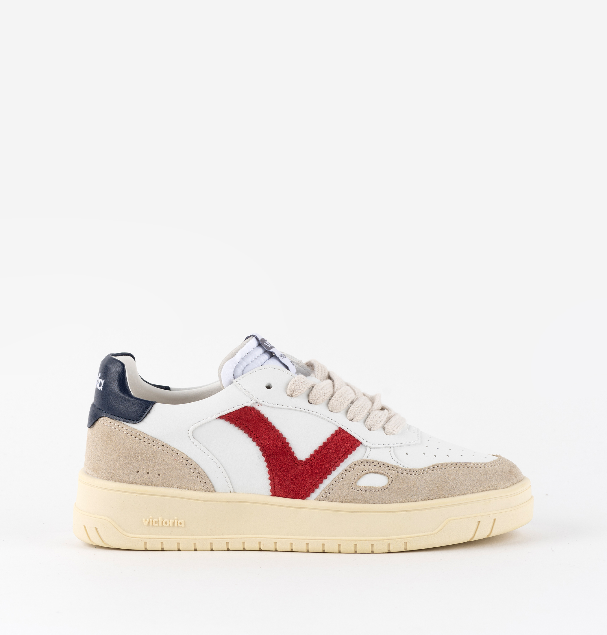 Zapatillas deportivas unisex fabricadas en efecto piel blanca con piezas de serraje. Detalle de color en la V de victoria lateral y en la pieza trasera, que se presenta con el logotipo de la marca grabado en blanco. Detalle en forma de ventana en el lateral. Puntera perforada para favorecer la transpiración. Suela de TPR ligeramente tostada.