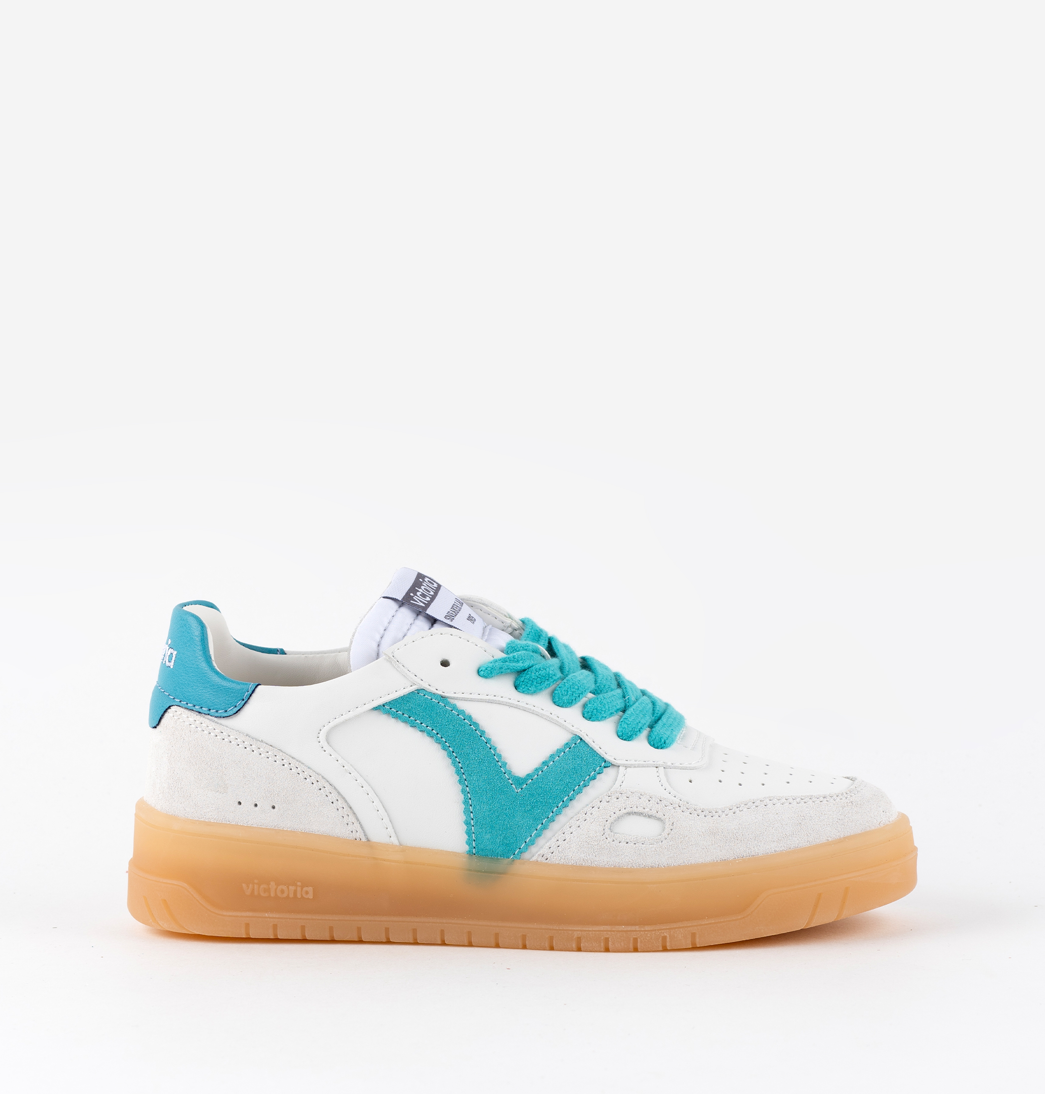 Zapatillas deportivas unisex fabricadas en efecto piel blanca con piezas de color y serraje. Contrastan la V de victoria lateral y la pieza trasera en colores a juego, y con el logotipo de la marca grabado en blanco. Cierre mediante cordones que hacen match con las piezas de color. Detalle en forma de ventana en el lateral. Puntera perforada para favorecer la transpiración. Suela de TPR en color caramelo.