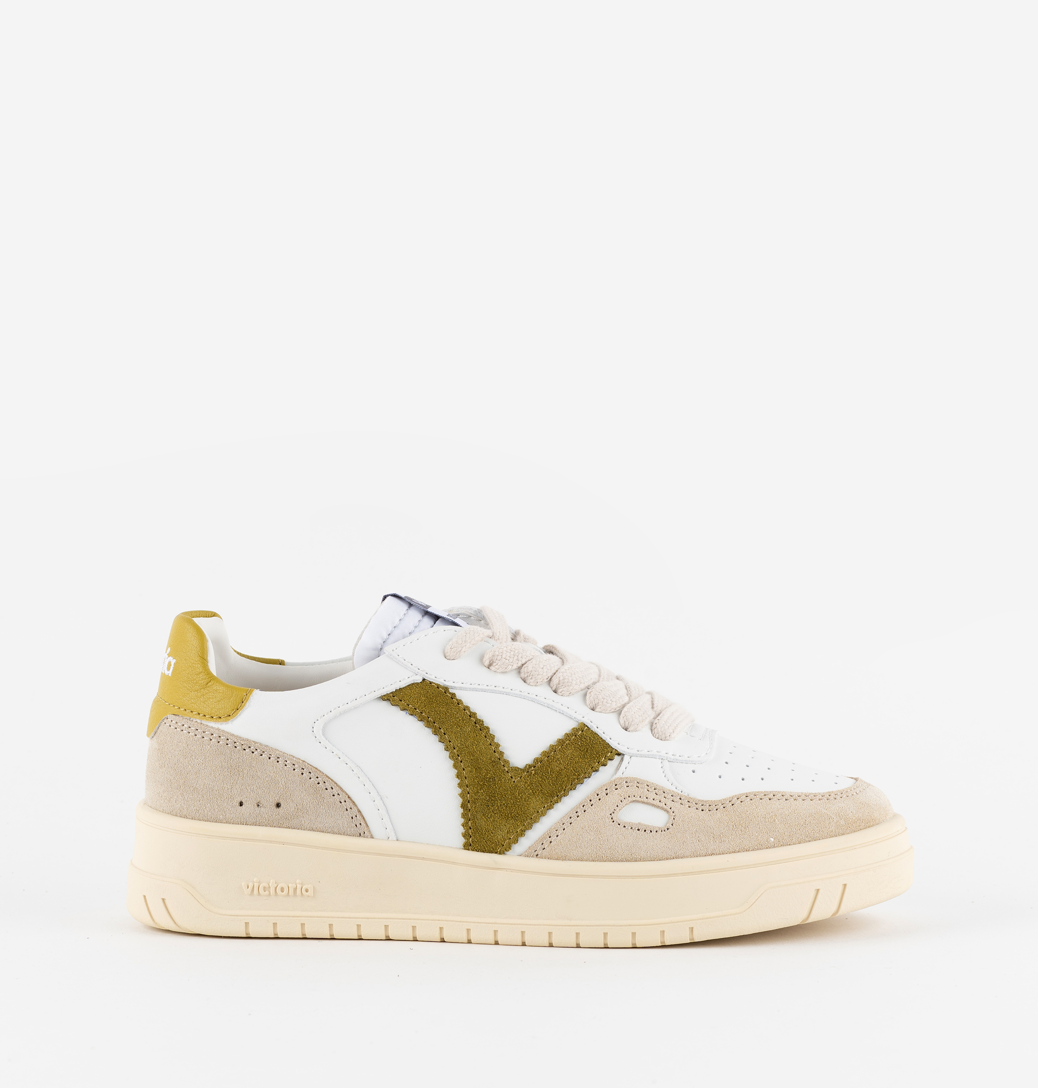 Zapatillas deportivas unisex fabricadas en efecto piel blanca con piezas de color y serraje. Contrastan la V de victoria lateral y la pieza trasera con el logotipo de la marca en colores a juego. Detalle en forma de ventana en el lateral. Puntera perforada para favorecer la transpiración. Suela de TPR ligeramente tostada.