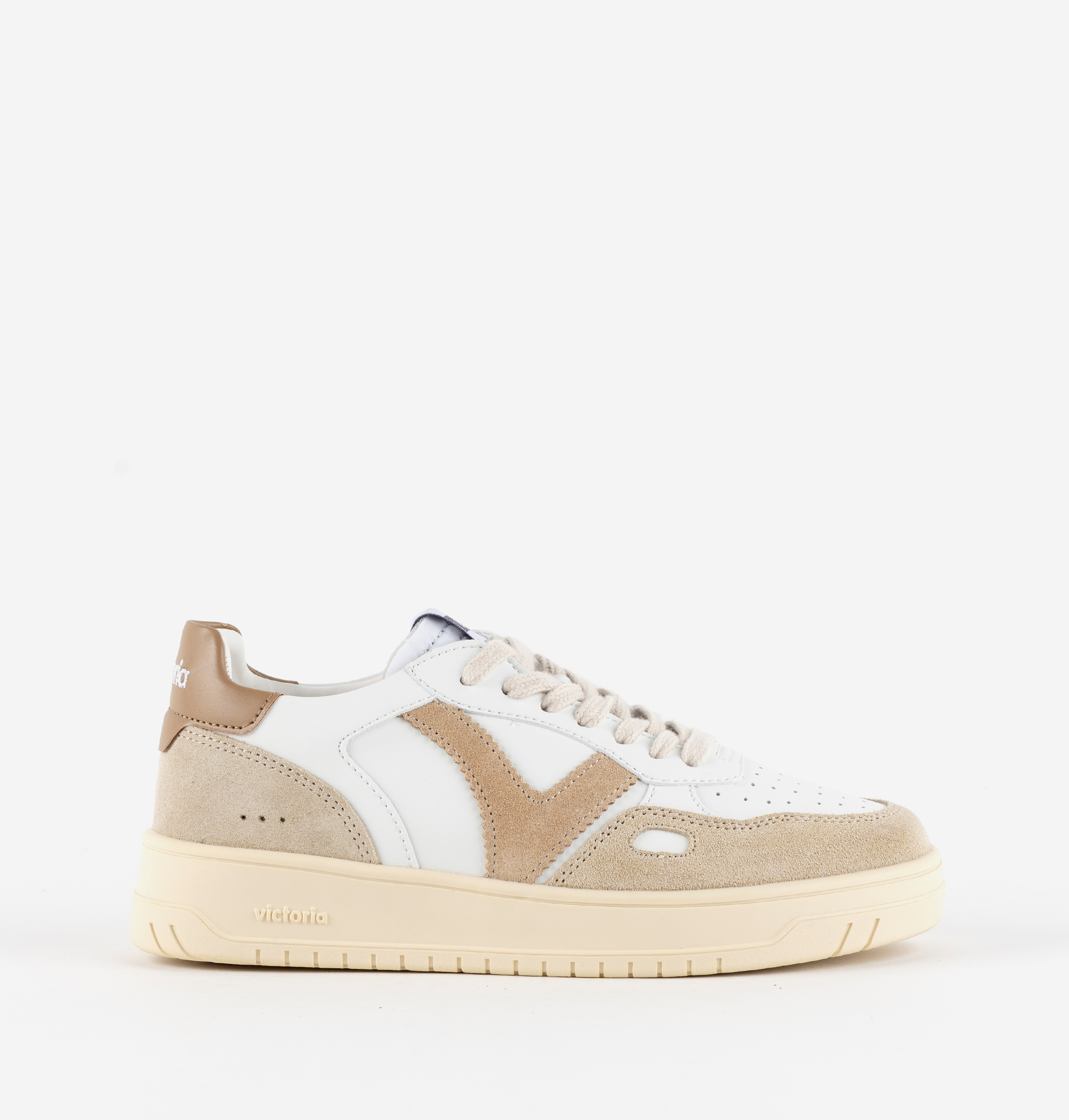 Zapatillas deportivas unisex fabricadas en efecto piel blanca con piezas de color y serraje. Contrastan la V de victoria lateral y la pieza trasera con el logotipo de la marca en colores a juego. Detalle en forma de ventana en el lateral. Puntera perforada para favorecer la transpiración. Suela de TPR ligeramente tostada.
