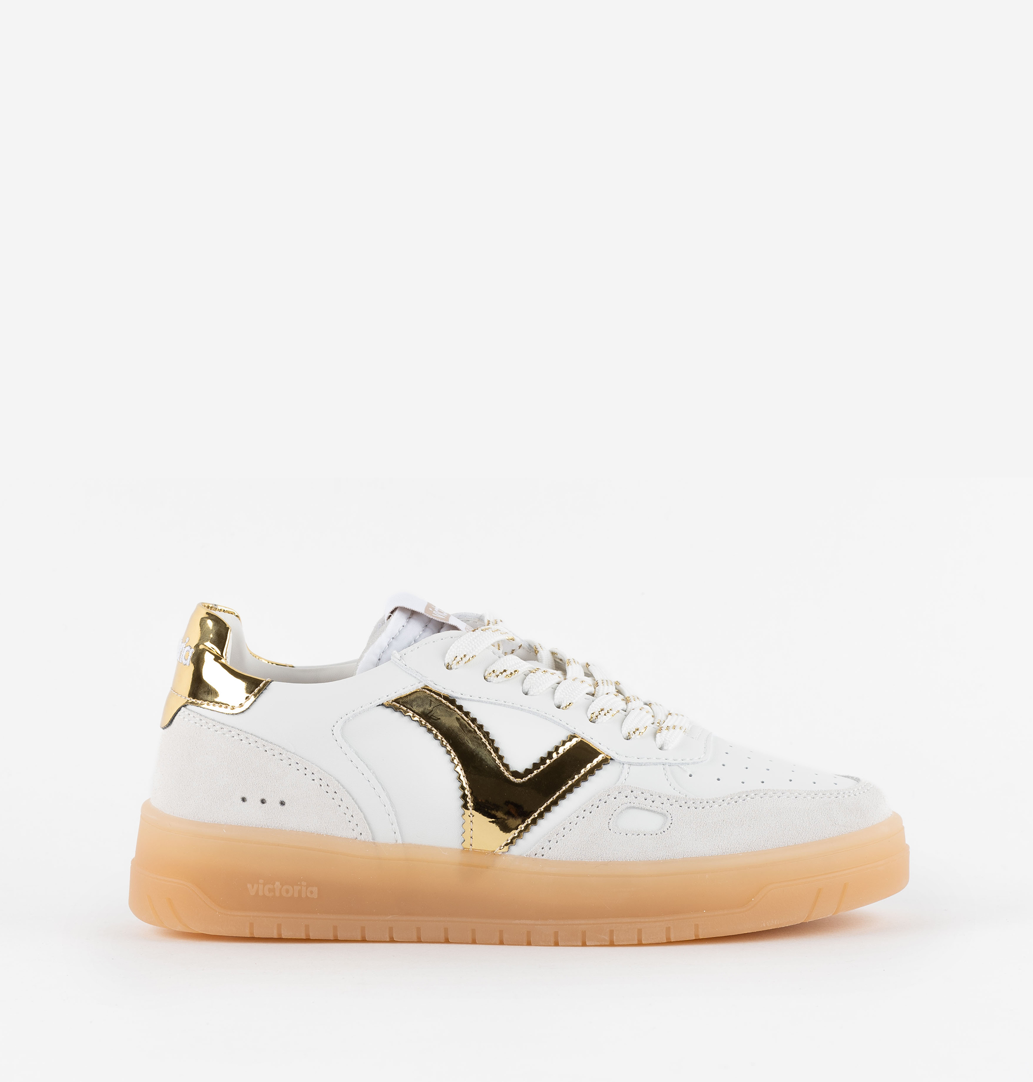 Zapatillas deportivas para mujer fabricadas en efecto piel blanca con piezas de serraje. V de victoria lateral y pieza trasera en tonos metalizados a juego. Logotipo de la marca grabado en blanco. Detalle en forma de ventana en el lateral. Puntera perforada para favorecer la transpiración. Suela de TPR en color caramelo.