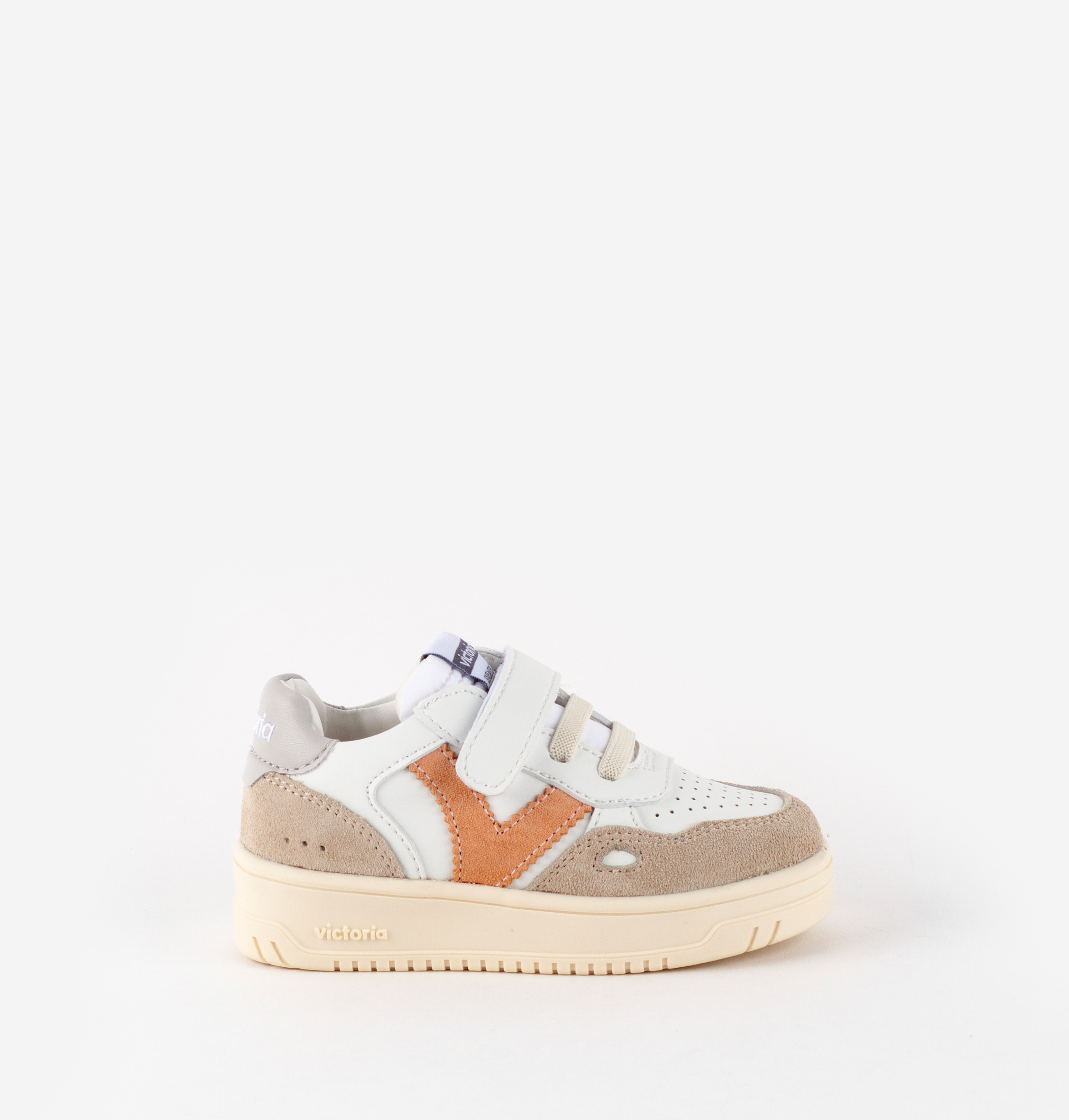 Estas zapatillas blancas para niños, fabricadas con un material efecto piel de alta calidad y piezas superpuestas de serraje en la puntera, talón y logo, destacan por su diseño. V retro en el lateral en contraste con la trasera y detalle en forma de ventana en el lateral. Suela ligeramente tostada y cierre mediante cordones elásticos y tira adherente. Incluye plantilla adicional acolchada para mayor confort.