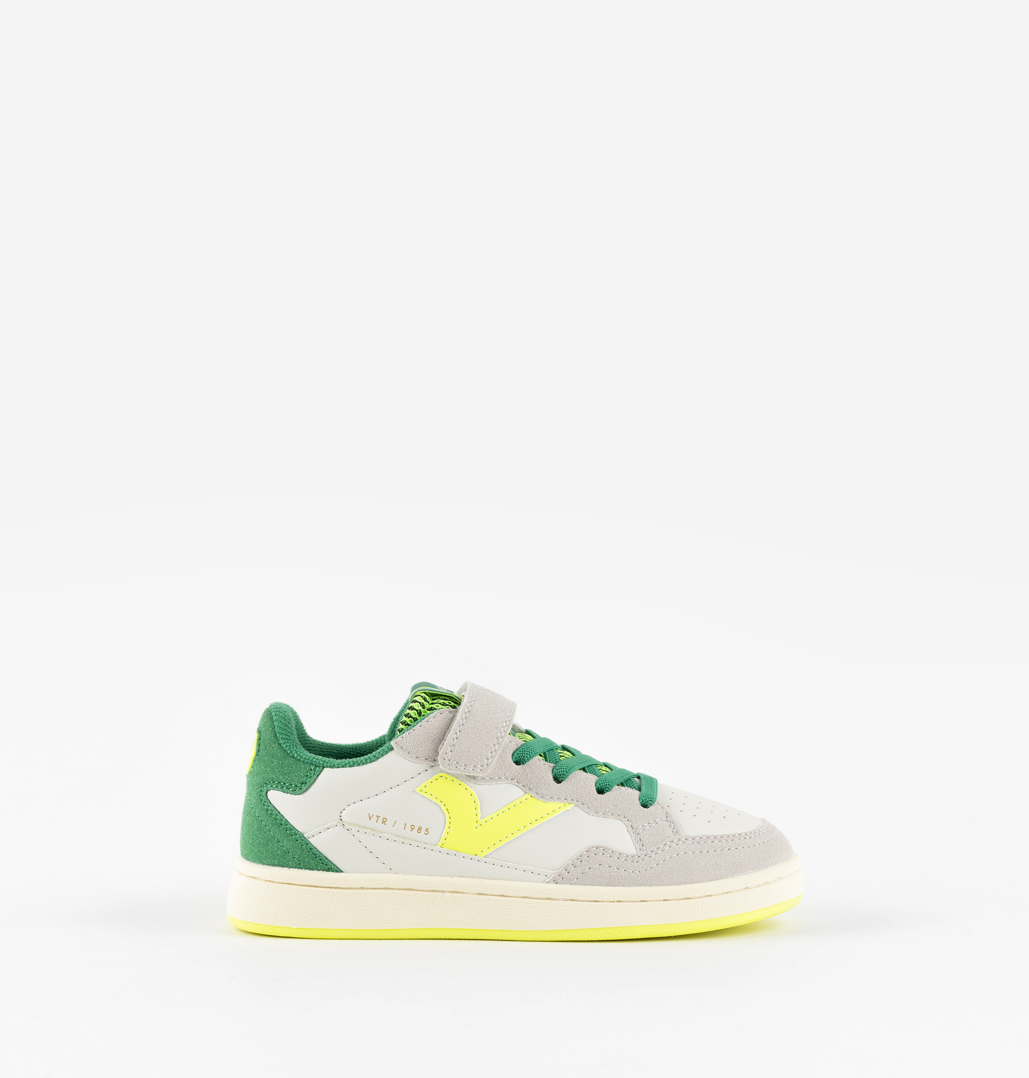 Zapatillas deportivas para niños en efecto piel con piezas flúor y fantasía. Cierre mediante cordón elástico, que se acompaña de una tira adherente para facilitar el calce y aportar sujección, fomentando su autonomía. Suela bicolor con acabado envejecido. Incluyen además una plantilla ergonómica que se adapta a la forma del pie y regala la sensación de comodidad.
