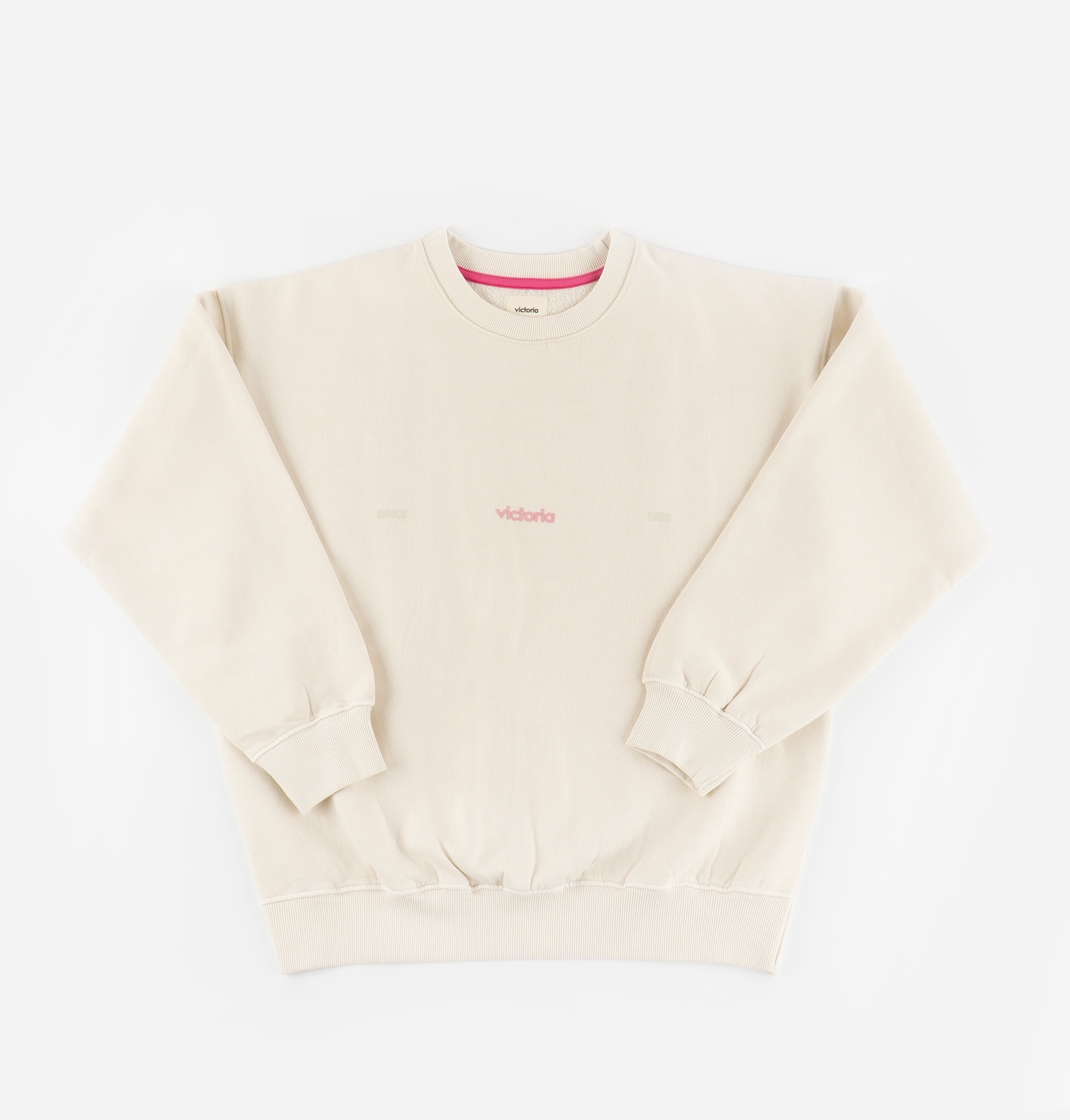 Sudadera para mujer con interior perchado y efecto lavado. Cuello redondo y manga larga. Detalle de estampación y texto combinado en relieve. Debido al proceso de tintado y lavado, el color de cada prenda es único y especial por lo que puede presentar diferencias.