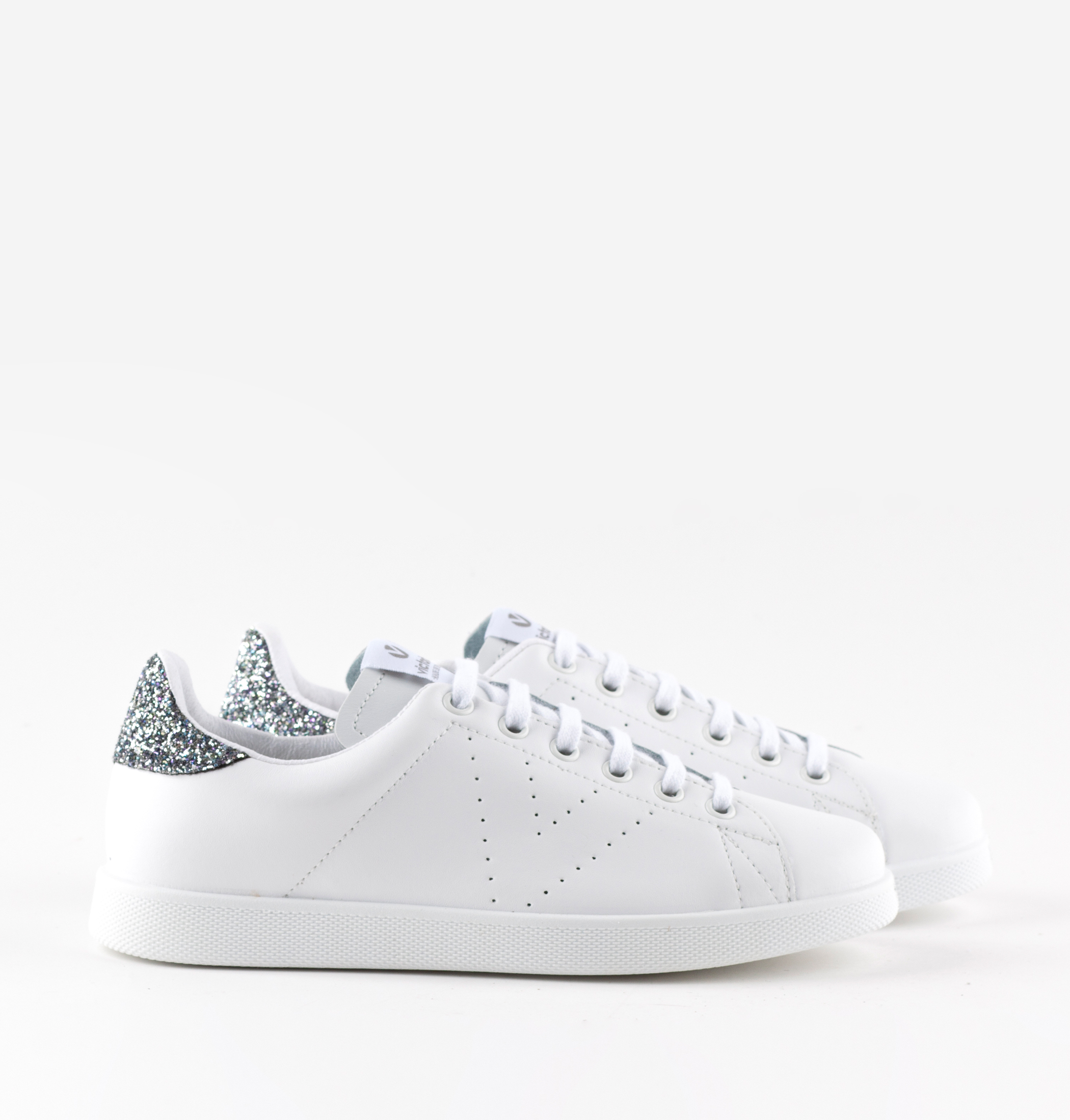 Zapatillas blancas tipo tenis para mujer y niña fabricadas en España en piel de alta calidad. V de victoria lateral perforada y pieza trasera en glitter. Cómoda suela de PVC elaborada con aceites vegetales en lugar de minerales, reduciendo así el impacto medioambiental.
