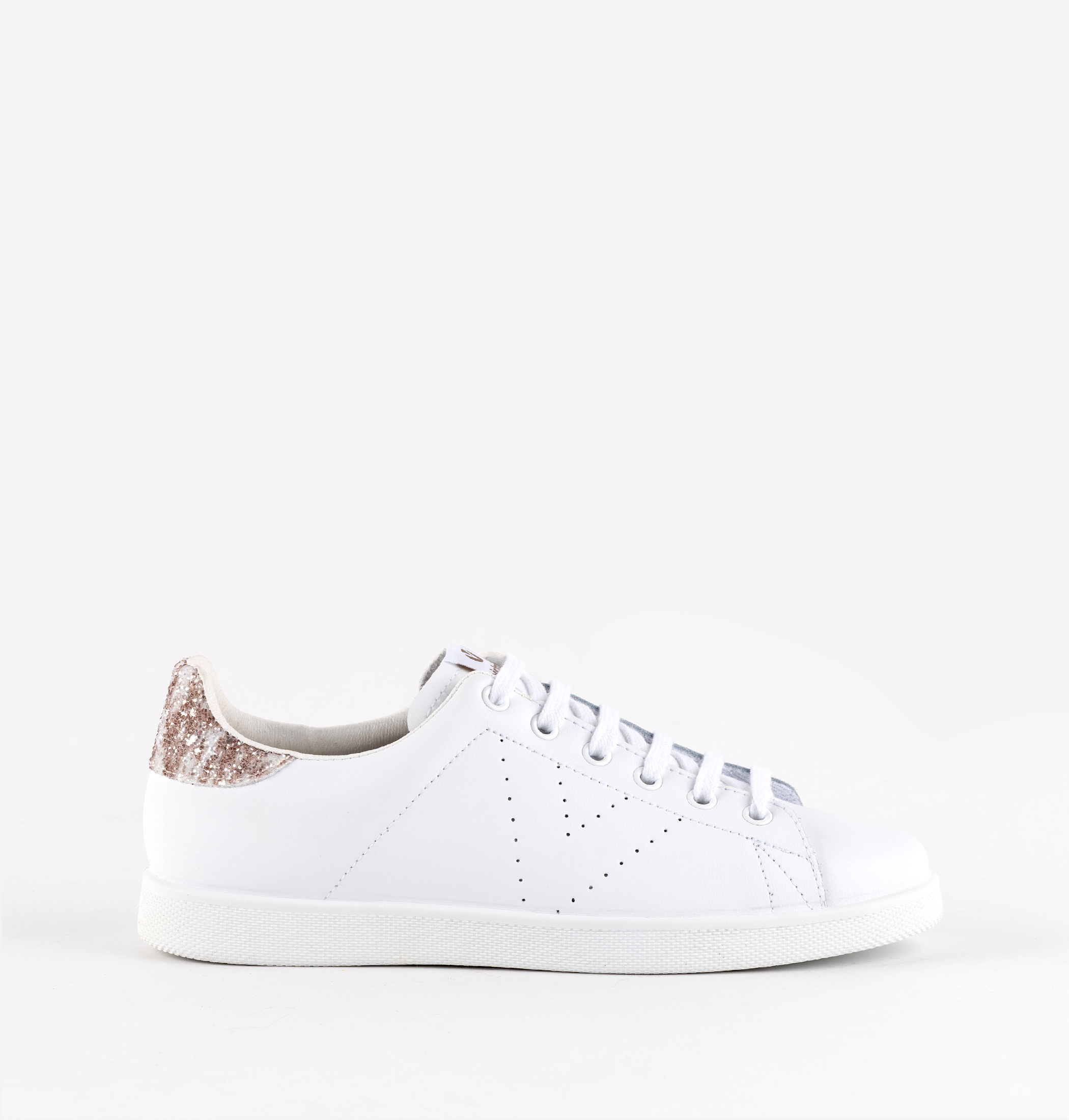 Zapatillas blancas tipo tenis para mujer y niña fabricadas en España en piel de alta calidad. V de victoria lateral perforada y pieza trasera en glitter. Cómoda suela de PVC elaborada con aceites vegetales en lugar de minerales, reduciendo así el impacto medioambiental.