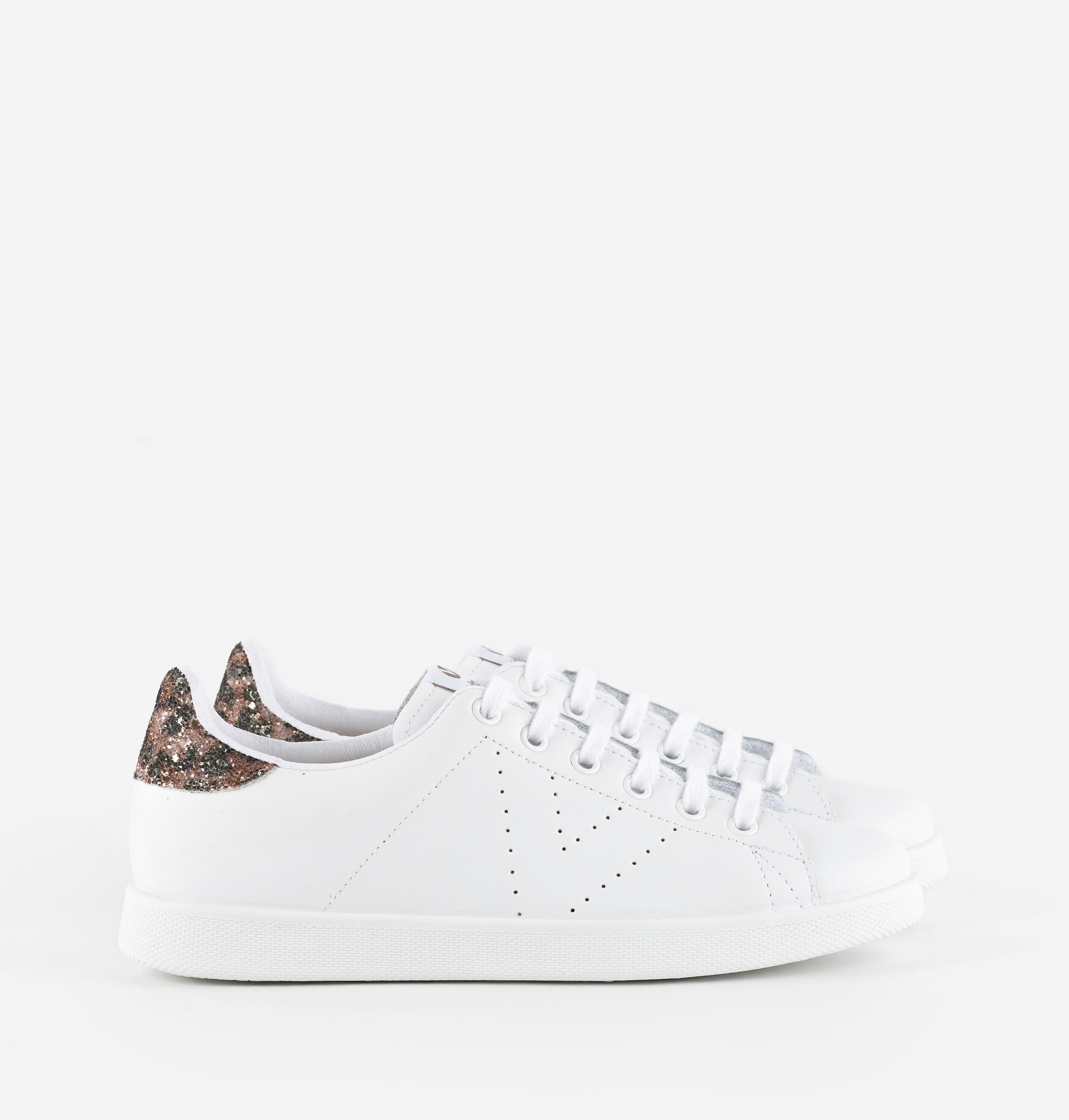 Zapatillas blancas tipo tenis para mujer y niña fabricadas en España en piel de alta calidad. V de victoria lateral perforada y pieza trasera en glitter. Cómoda suela de PVC elaborada con aceites vegetales en lugar de minerales, reduciendo así el impacto medioambiental.