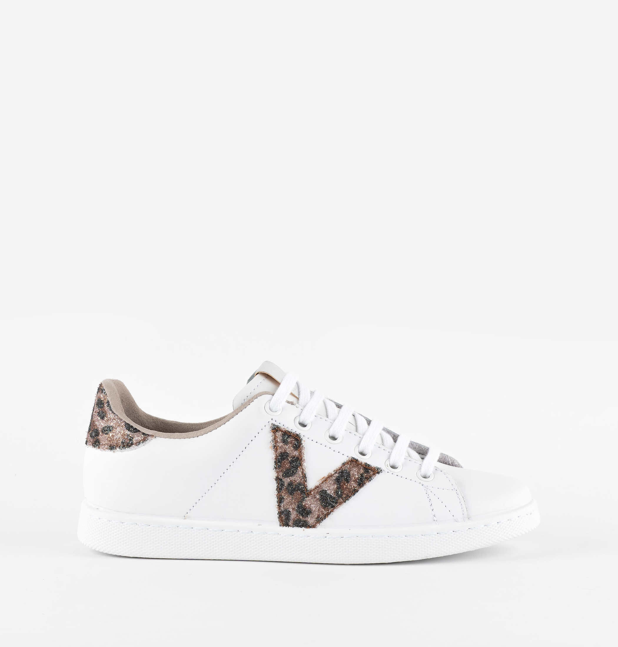 Zapatillas blancas tipo tenis para mujer fabricadas en España en piel de alta calidad. V de victoria lateral y pieza trasera en glitter y animal print. Etiqueta metalizada en la lengüeta. Cómoda suela de PVC elaborada con aceites vegetales en lugar de minerales, reduciendo así el impacto medioambiental.