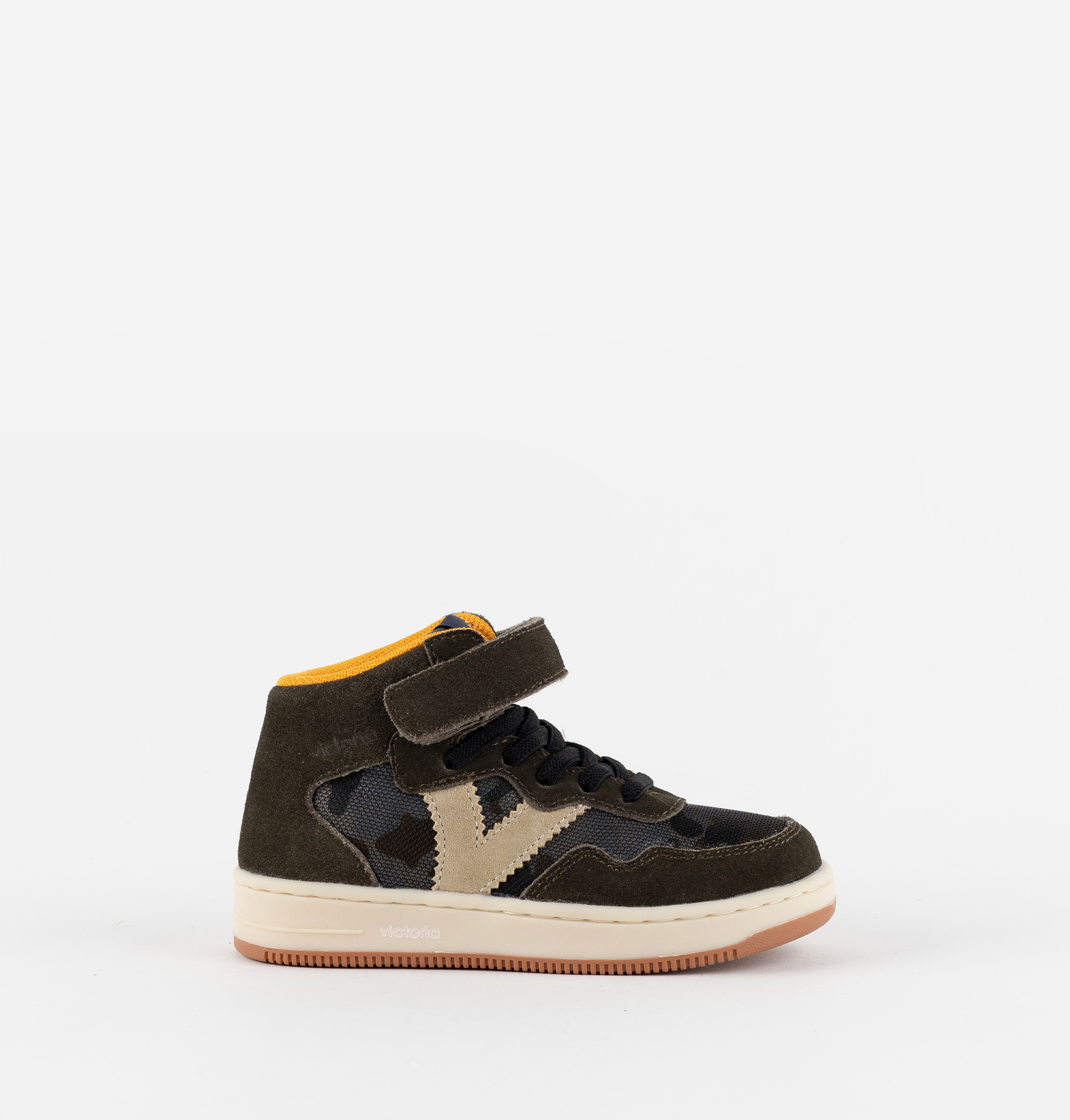Zapatillas deportivas de caña alta para niños. Fabricadas en glitter (color beige) y estampado de camuflaje (color kaki) con piezas de serraje superpuestas al tono. V retro de victoria lateral en contraste: en animal print (color beige) y en crudo (color kaki). Cierre mediante cordones elásticos y tira adherente que facilita el calce y hace que se ajusten perfectamente al pie. En color beige, éstos hacen match en rosa con el forro interior, que contrasta también en kaki en naranja con el resto de la zapatilla. Con perforado en el empeine para favorecer la transpiración. Suela bicolor con patín antideslizante.