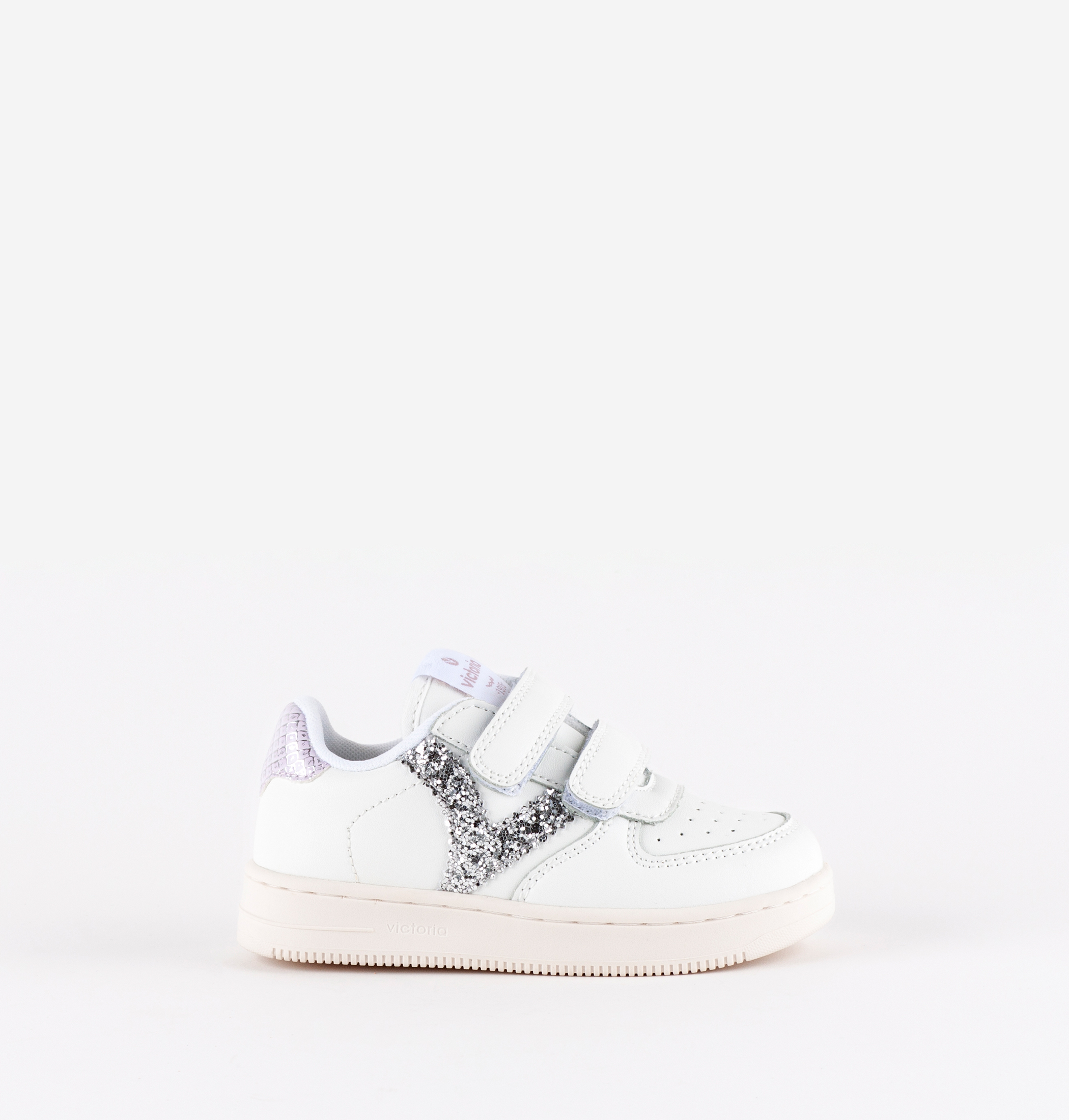 Zapatillas deportivas para niñas fabricadas en material efecto piel blanca. V retro de victoria en el lateral en glitter y animal print, en combinación con la pieza trasera. Cierre mediante dos tiras adherentes, tres a partir de la talla 36, que facilitan el calce y hacen que se ajusten perfectamente al pie. Con perforado en el empeine para favorecer la transpiración.