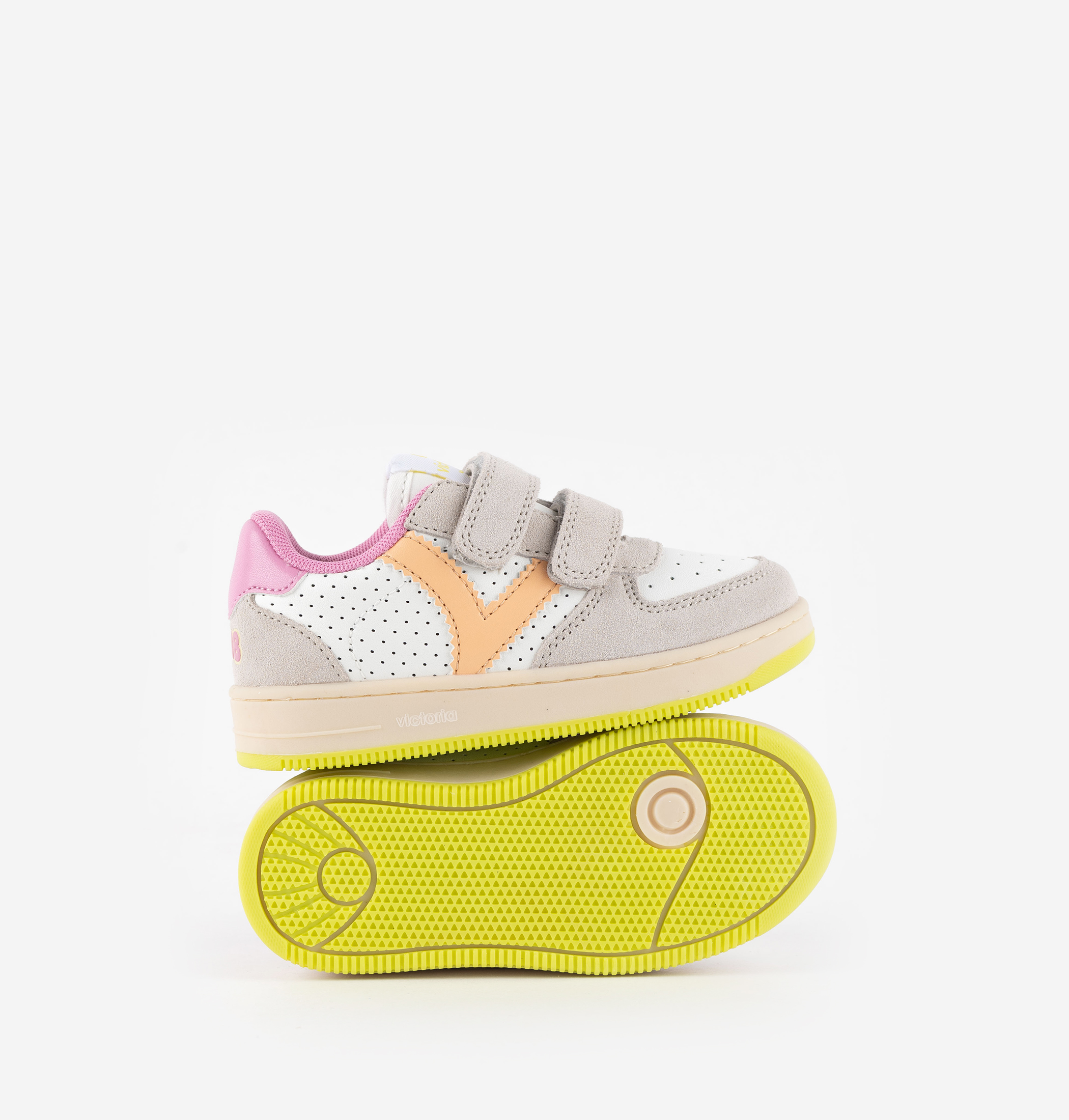 Zapatillas deportivas para niños fabricadas en efecto piel blanca microperforada con piezas grises superpuestas de serraje. V de victoria lateral, forro y pieza trasera en colores en contraste. Incorporan detalles flúor en suela y en la etiqueta de la lengüeta. Cierre con dos tiras adherentes, que aportan mayor sujección y facilitan el calce, fomentando su autonomía. Cómoda suela bicolor de TPR y puntera perforada para favorecer la transpiración.