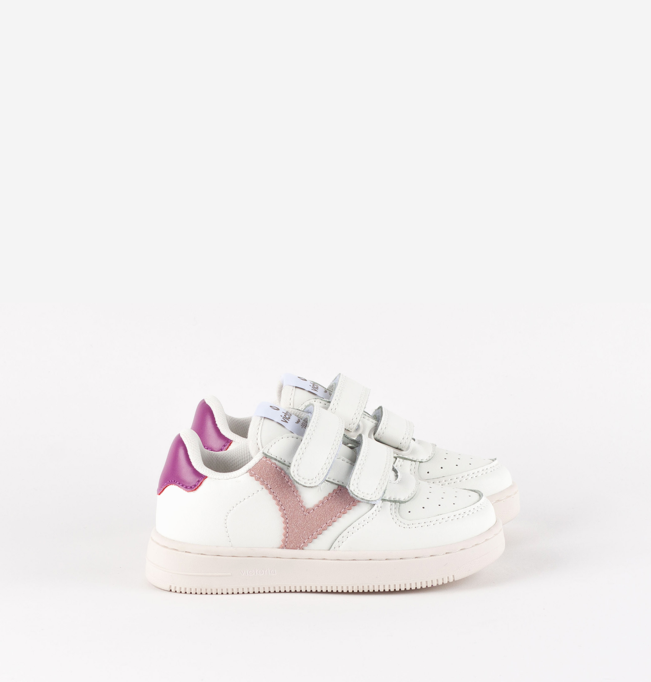 Zapatillas deportivas para niños fabricadas en efecto piel blanca. Incorporan detalles de color en la V de victoria lateral y la pieza trasera. Cierre con tiras adherentes (dos hasta la talla 35 y tres a partir de la 36) que aportan mayor sujección y facilitan el calce, fomentando su autonomía. Cómoda suela de TPR y puntera perforada para favorecer la transpiración.