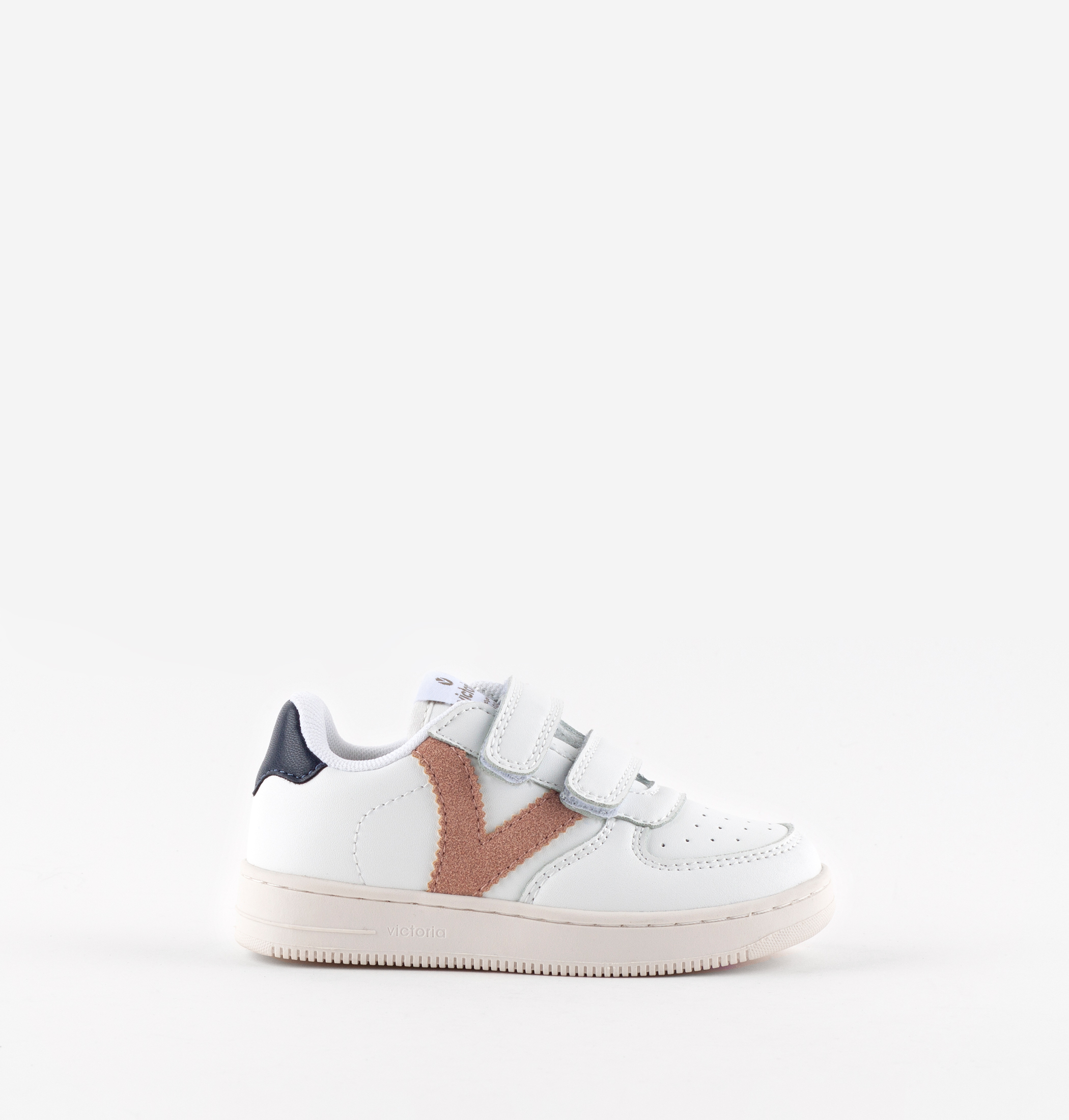 Zapatillas deportivas para niños fabricadas en efecto piel blanca. Incorporan detalles de color en la V de victoria lateral y la pieza trasera. Cierre con tiras adherentes (dos hasta la talla 35 y tres a partir de la 36) que aportan mayor sujección y facilitan el calce, fomentando su autonomía. Cómoda suela de TPR y puntera perforada para favorecer la transpiración.