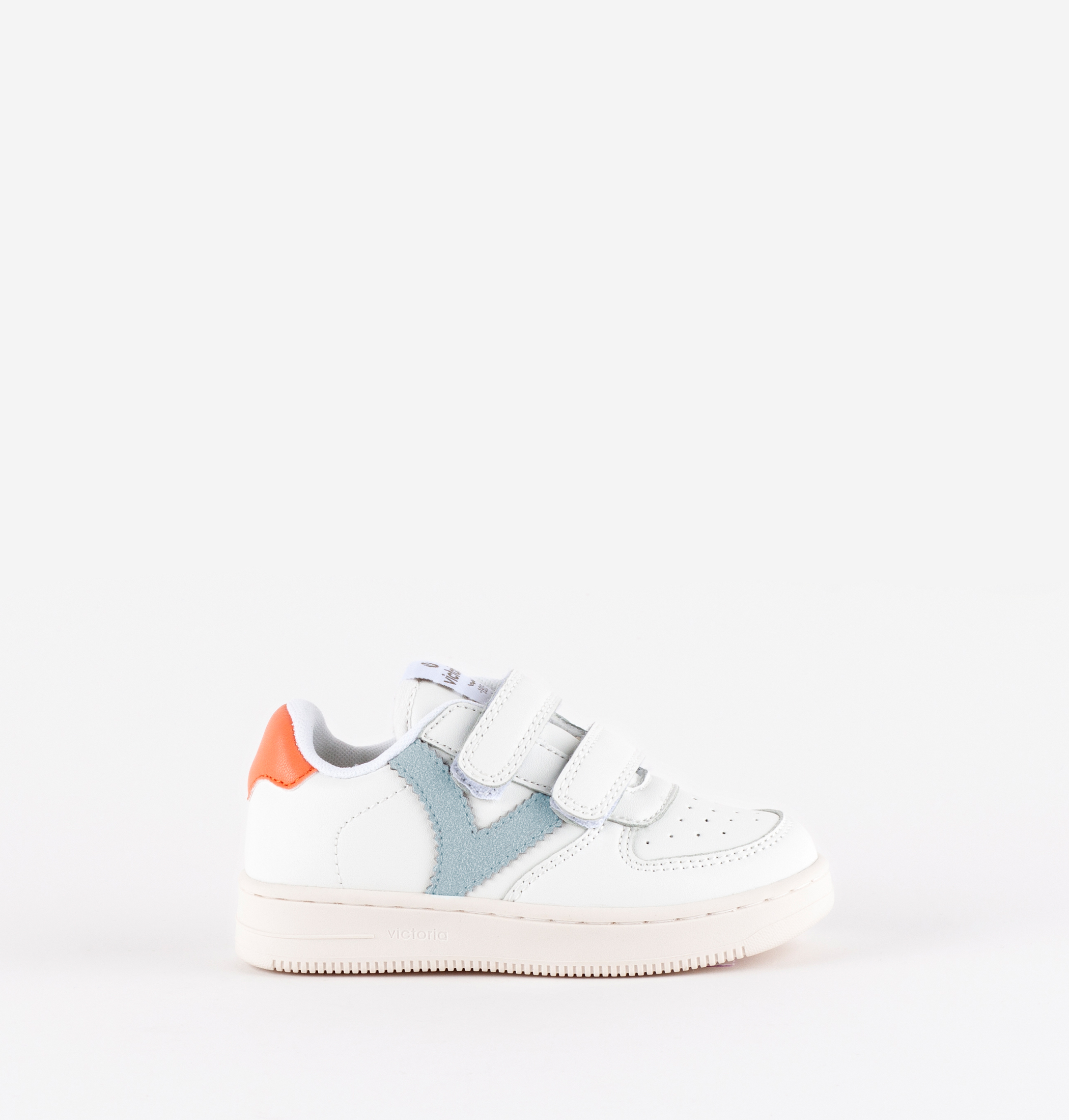 Zapatillas deportivas para niños fabricadas en material efecto piel blanca. V retro de victoria en el lateral, que hace contraste junto con la pieza trasera. Cierre mediante dos tiras adherentes, tres a partir de la talla 36, que facilitan el calce y hacen que se ajusten perfectamente al pie. Con perforado en el empeine para favorecer la transpiración.