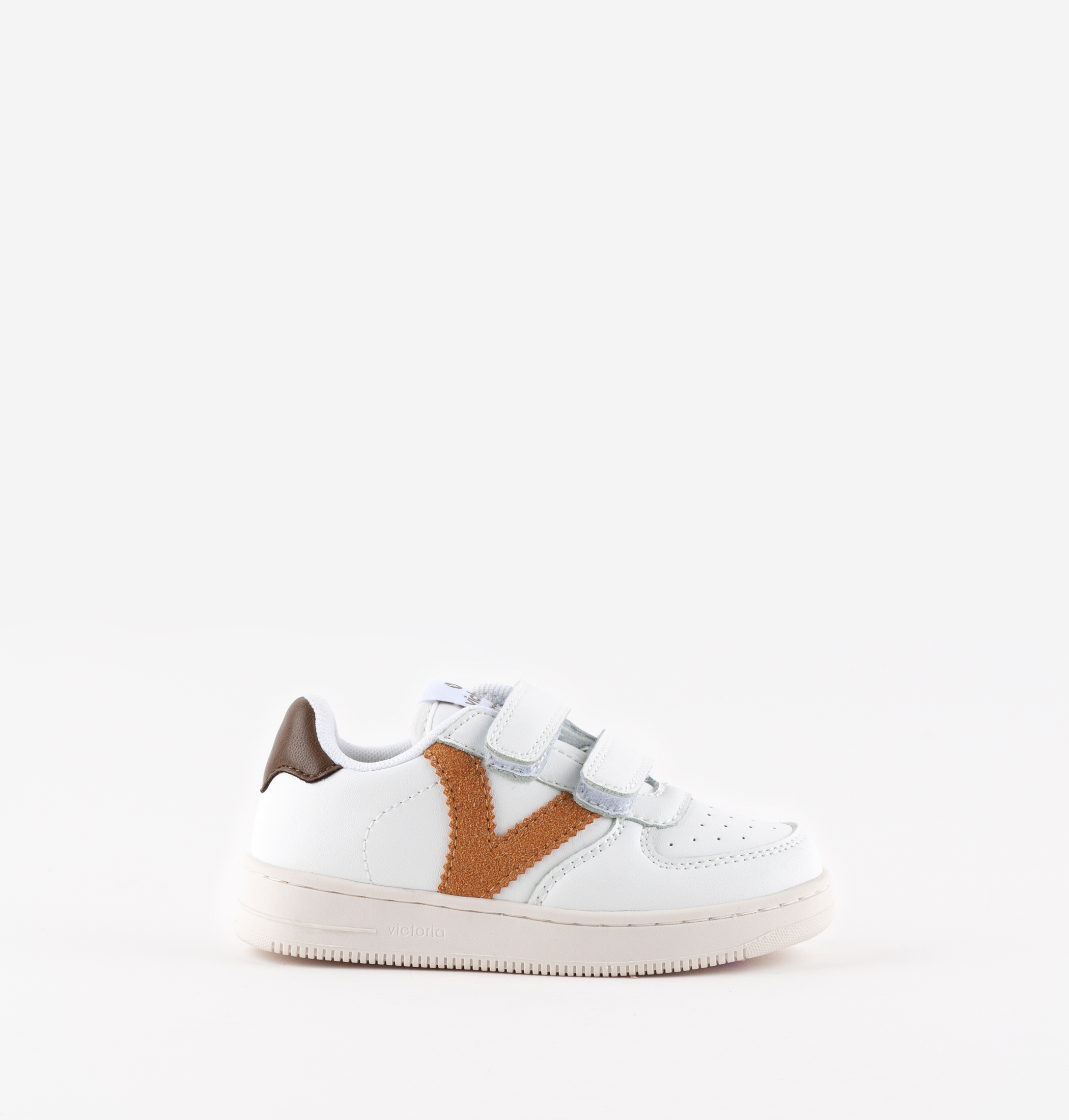 Zapatillas deportivas para niños fabricadas en material efecto piel blanca. V retro de victoria en el lateral, que hace contraste junto con la pieza trasera. Cierre mediante dos tiras adherentes, tres a partir de la talla 36, que facilitan el calce y hacen que se ajusten perfectamente al pie. Con perforado en el empeine para favorecer la transpiración.