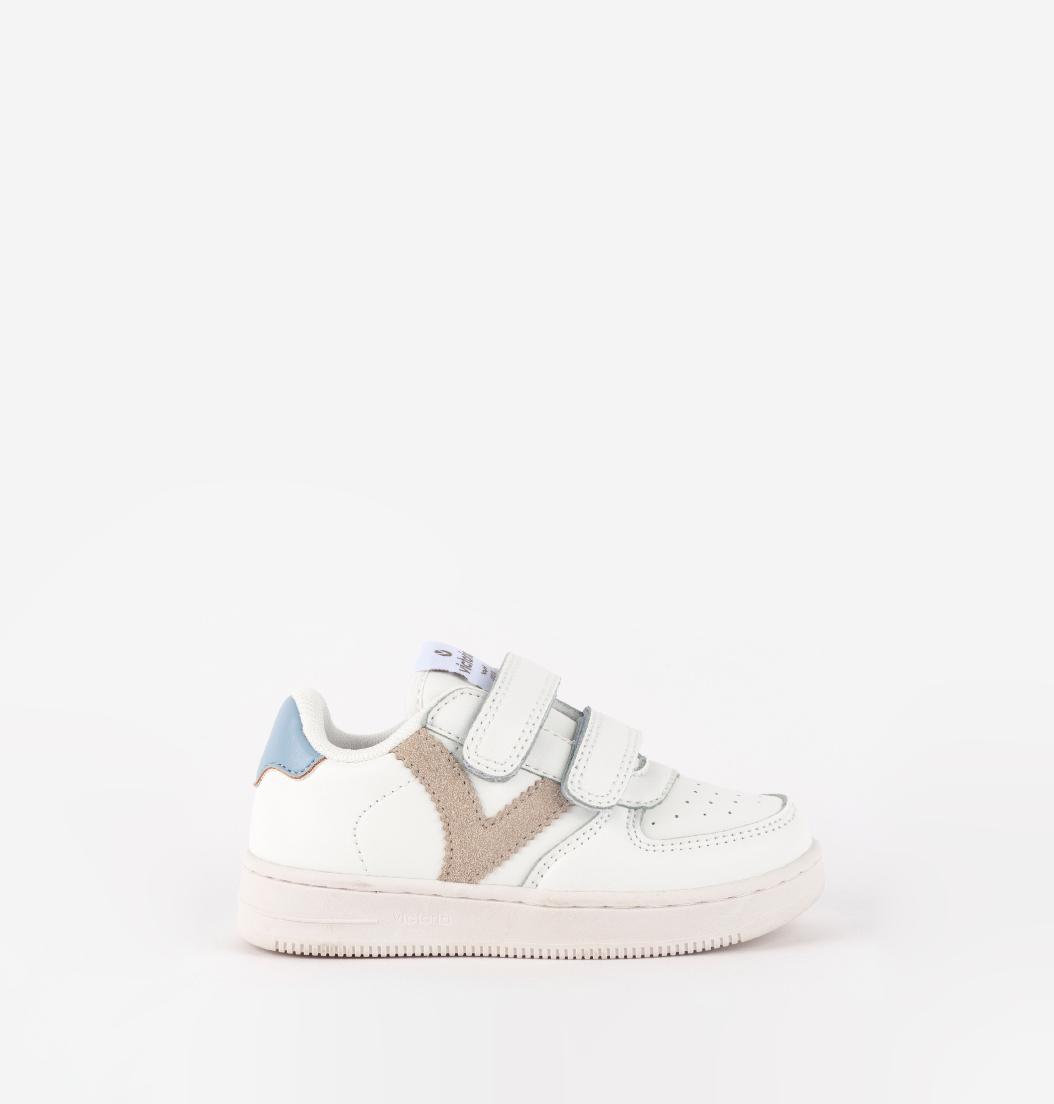 Zapatillas deportivas para niños fabricadas en material efecto piel blanca. V retro de victoria en el lateral, que hace contraste junto con la pieza trasera. Cierre mediante dos tiras adherentes, tres a partir de la talla 36, que facilitan el calce y hacen que se ajusten perfectamente al pie. Con perforado en el empeine para favorecer la transpiración.