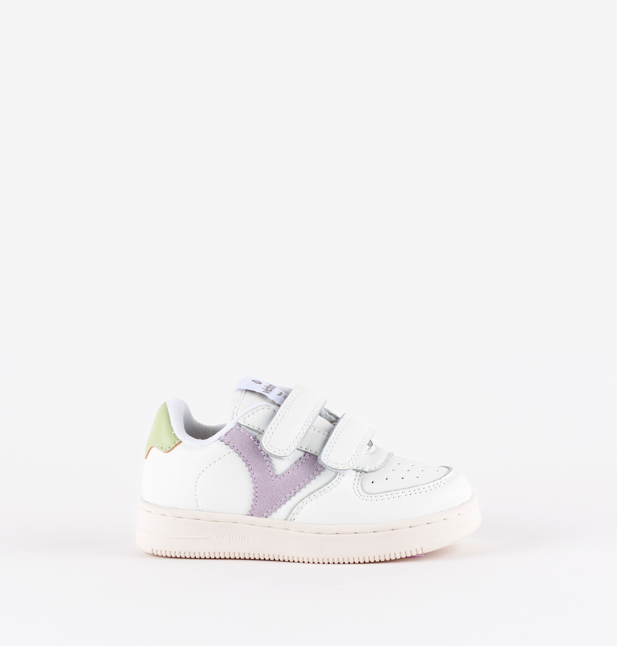 Zapatillas deportivas para niños fabricadas en material efecto piel blanca. V retro de victoria en el lateral, que hace contraste junto con la pieza trasera. Cierre mediante dos tiras adherentes, tres a partir de la talla 36, que facilitan el calce y hacen que se ajusten perfectamente al pie. Con perforado en el empeine para favorecer la transpiración.