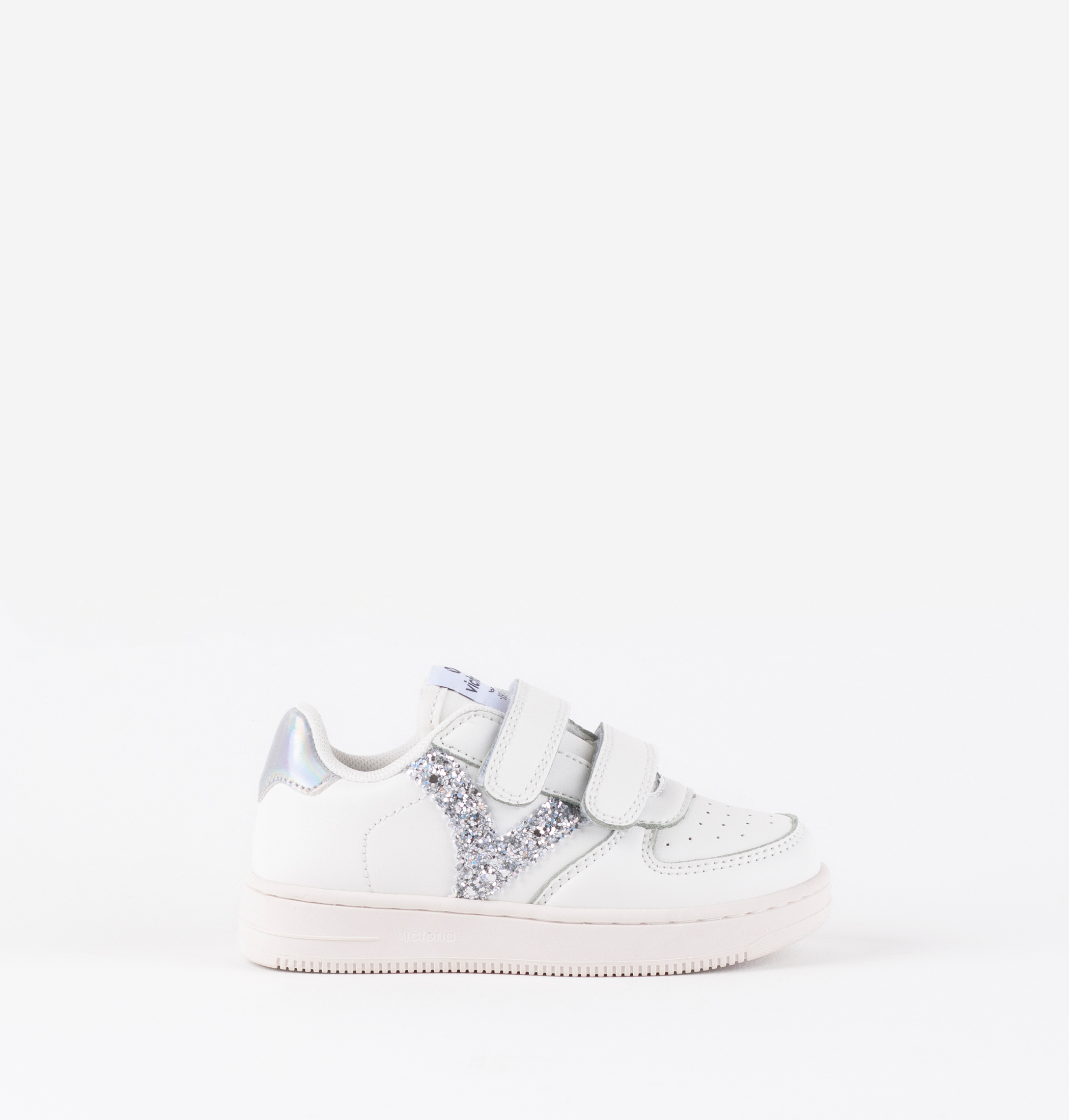 Zapatillas deportivas para niñas fabricadas en efecto piel blanca. V de victoria lateral y pieza trasera en combinaciones de glitter y animal print. Cierre con tiras adherentes (dos hasta la talla 35 y tres a partir de la 36) que aportan mayor sujección y facilitan el calce, fomentando su autonomía. Cómoda suela de TPR y puntera perforada para favorecer la transpiración.