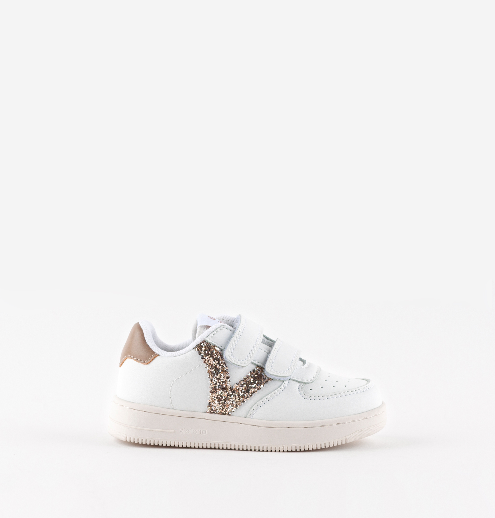 Zapatillas deportivas para niñas fabricadas en efecto piel blanca. V de victoria lateral y pieza trasera en combinaciones de glitter y animal print. Cierre con tiras adherentes (dos hasta la talla 35 y tres a partir de la 36) que aportan mayor sujección y facilitan el calce, fomentando su autonomía. Cómoda suela de TPR y puntera perforada para favorecer la transpiración.