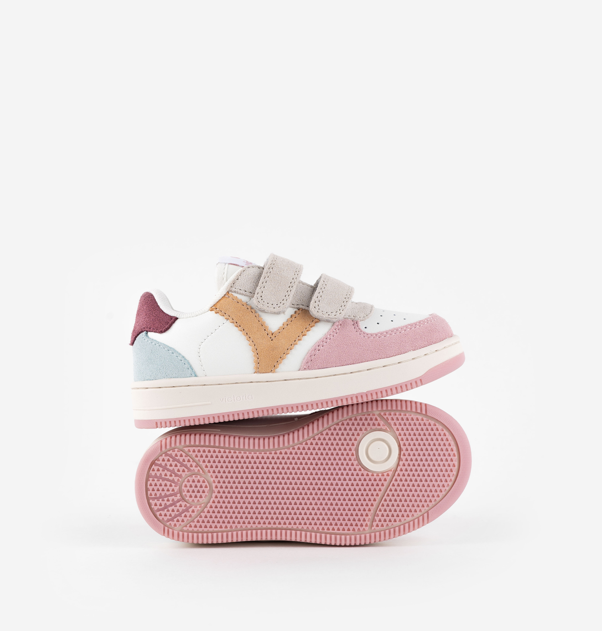 Zapatillas deportivas para niños fabricadas en efecto piel blanca con piezas superpuestas multicolor de serraje. Cierre con tiras adherentes (dos hasta la talla 35 y tres a partir de la 36) que aportan mayor sujección y facilitan el calce, fomentando su autonomía. Cómoda suela bicolor de TPR y puntera perforada para favorecer la transpiración.