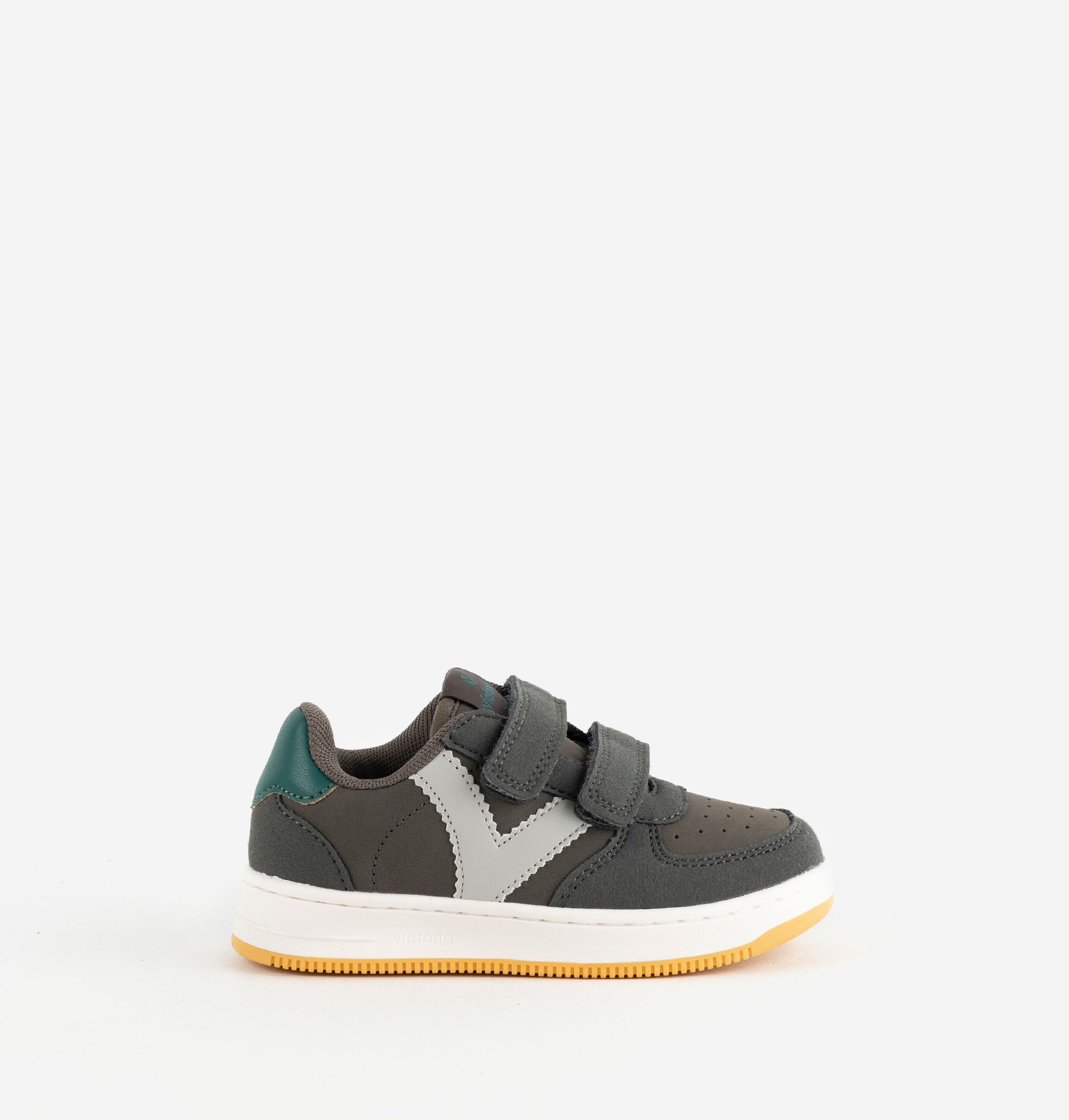 Zapatillas deportivas para niños fabricadas en material efecto piel con piezas superpuestas de serraje al tono. V retro de victoria lateral en contraste y detalle de color en pieza trasera. Cierre mediante dos tiras adherentes, tres a partir de la talla 36, que facilitan el calce y hacen que se ajusten perfectamente al pie. Con perforado en el empeine para favorecer la transpiración. Suela bicolor con patín antideslizante.