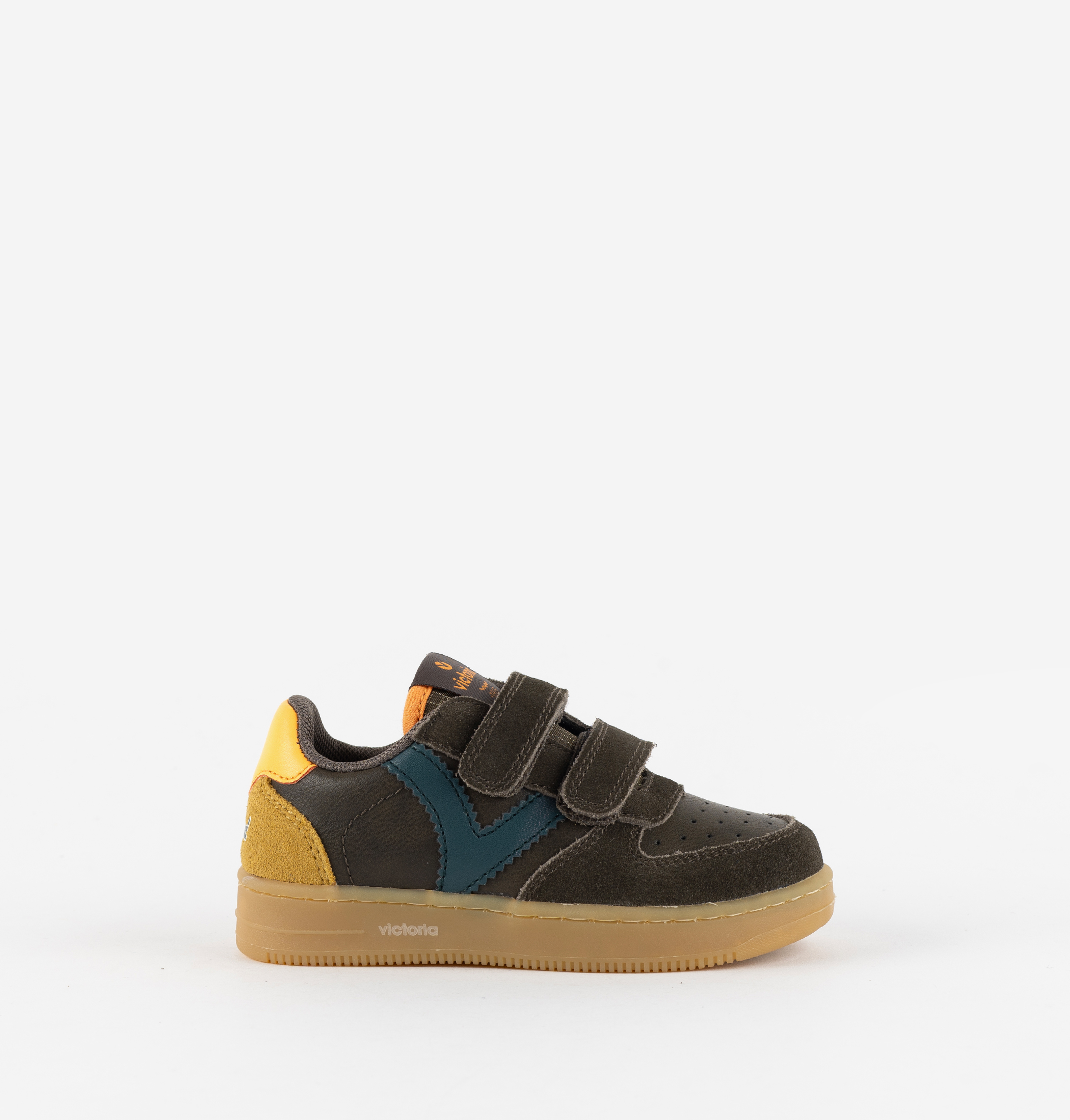 Zapatillas deportivas para niños fabricadas en efecto piel con piezas de serraje al tono. V retro de victoria lateral en contraste y detalle de color en pieza trasera. Cierre mediante dos tiras adherentes, tres a partir de la talla 36, que facilitan el calce y hacen que se ajusten perfectamente al pie. Con perforado en el empeine para favorecer la transpiración. Suela en color caramelo.