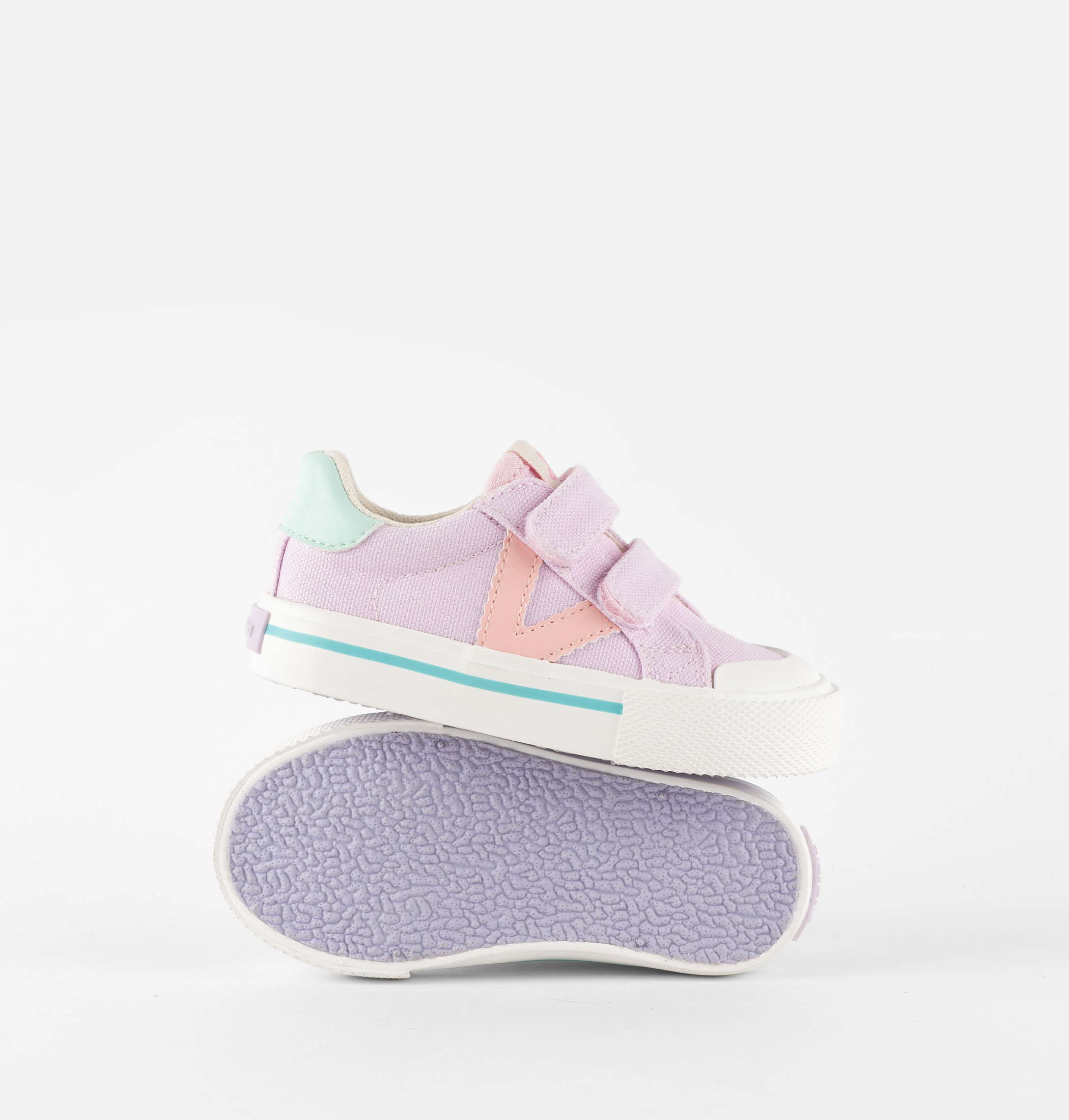 Zapatillas deportivas para niños fabricadas en lona. V de victoria lateral en contraste junto con la pieza trasera. Etiqueta en la lengüeta con dibujo impreso. Cierre con dos tiras adherentes que aportan mayor sujección y favorecen su autonomía al calzarse. Suela de goma con refuerzo en la puntera para mayor resistencia y durabilidad.