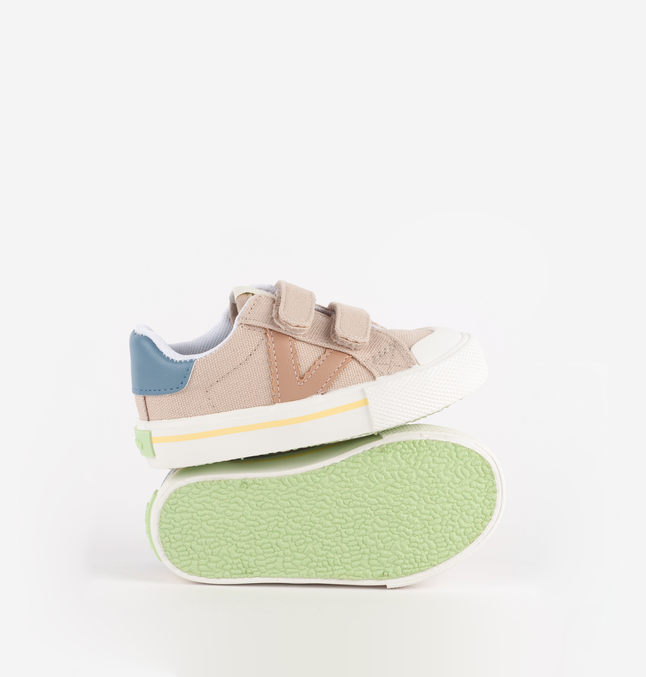 Zapatillas deportivas para niños fabricadas en lona. V de victoria lateral en contraste junto con la pieza trasera. Etiqueta en la lengüeta con dibujo impreso. Cierre con dos tiras adherentes que aportan mayor sujección y favorecen su autonomía al calzarse. Suela de goma con refuerzo en la puntera para mayor resistencia y durabilidad.