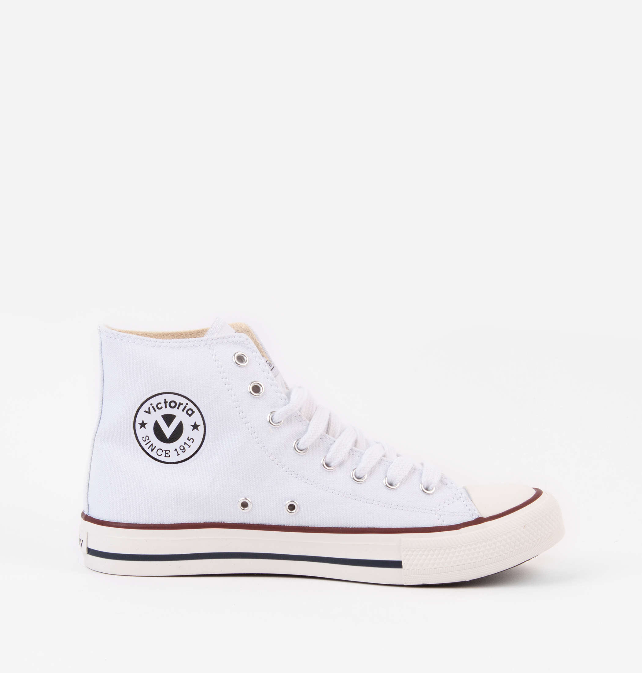 Zapatillas de caña alta fabricadas en lona para adulto y niño. Parche de victoria impreso en el lateral interior y etiqueta en la lengüeta. Suela de goma con refuerzo en la puntera para mayor resistencia y durabilidad.
