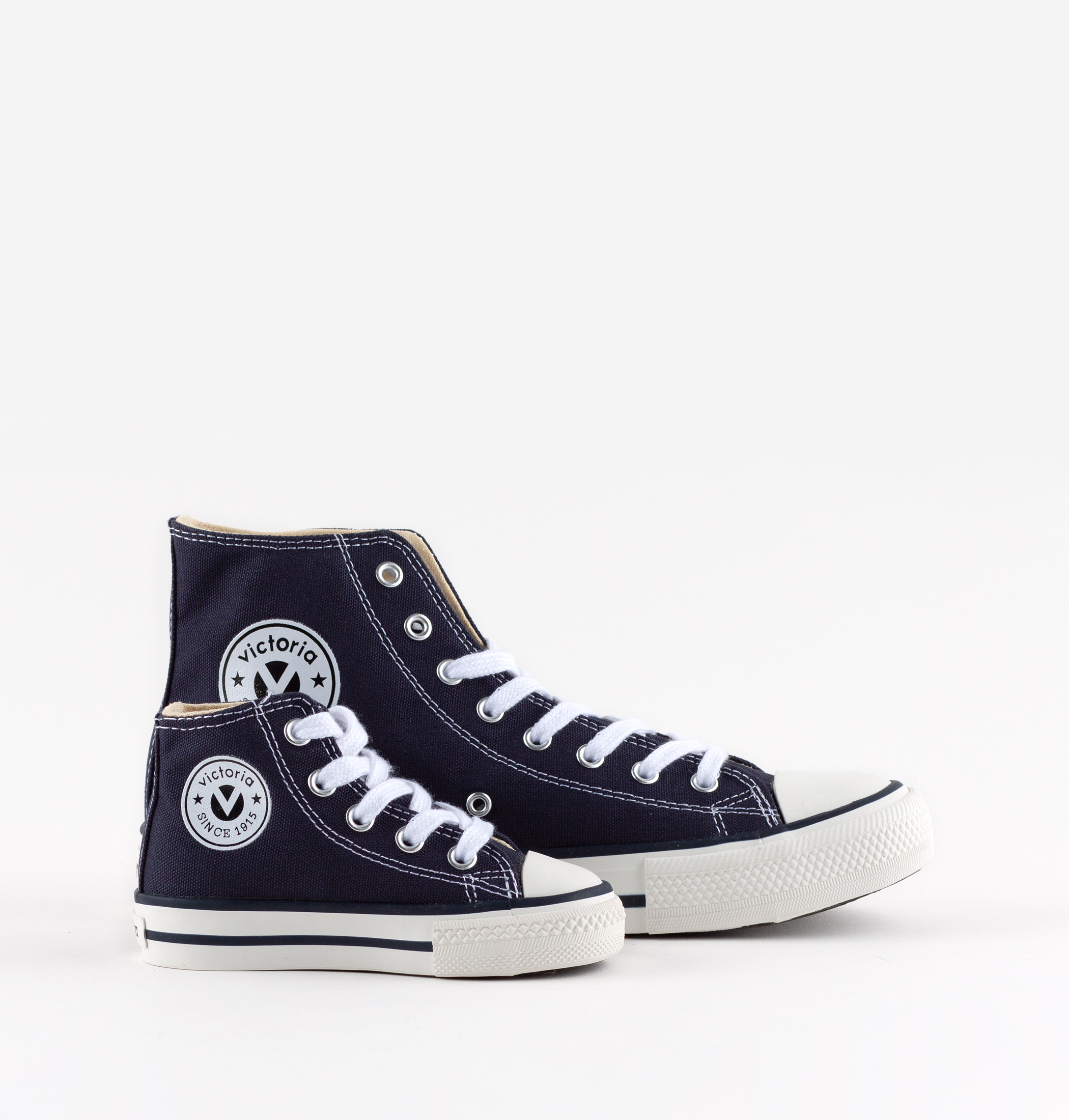 Zapatillas de caña alta fabricadas en lona para adulto y niño. Parche de victoria impreso en el lateral interior y etiqueta en la lengüeta. Suela de goma con refuerzo en la puntera para mayor resistencia y durabilidad.