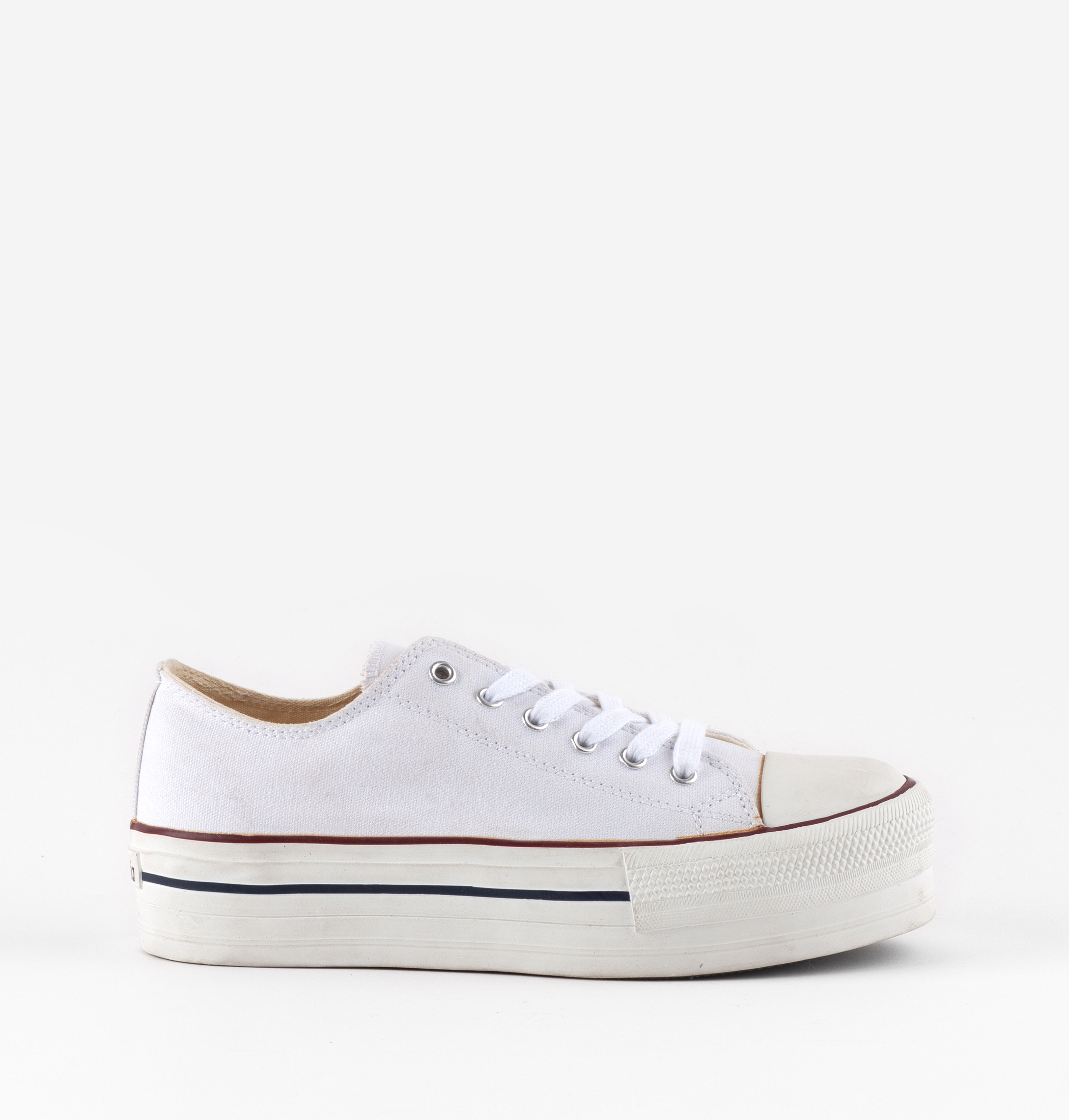Zapatillas de lona con plataforma para mujer y niña. Etiqueta de victoria en la lengüeta y cierre mediante cordones blancos. Suela de goma de 4 cm de altura con refuerzo en la puntera para mayor resistencia y durabilidad.