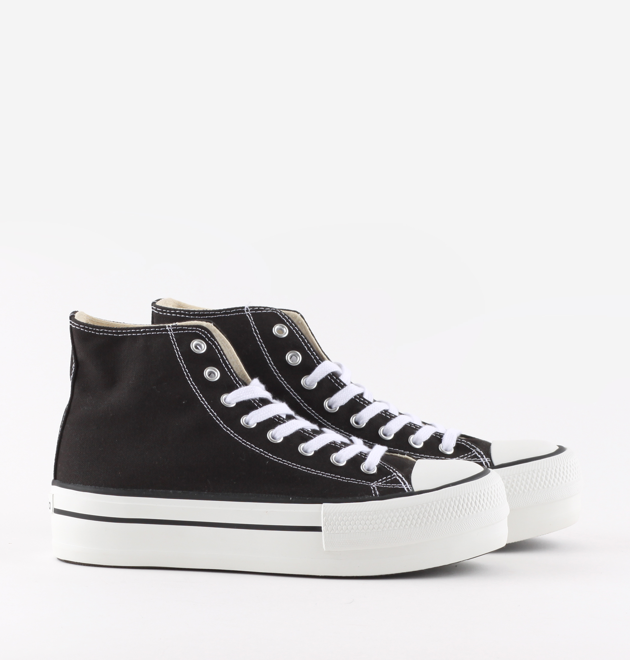 Zapatillas de caña alta con plataforma fabricadas en lona para mujer y niña. Parche de victoria impreso en el lateral interior y etiqueta en la lengüeta. Cierre mediante cordones blancos. Suela de goma de 4 cm de altura con refuerzo en la puntera para mayor resistencia y durabilidad.