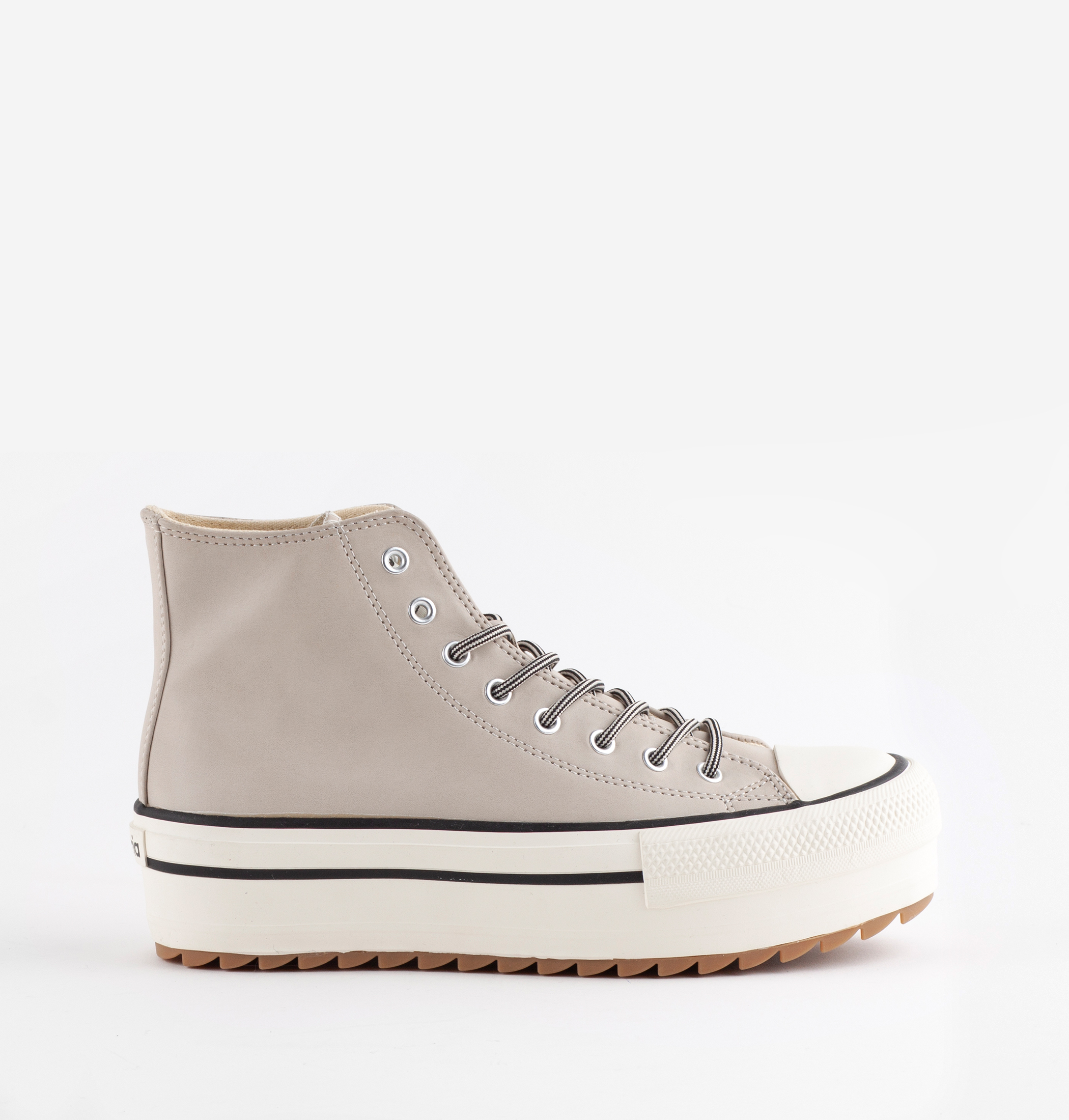 Zapatillas de caña alta para mujer fabricadas en material efecto piel. Parche marrón de victoria en relieve en el lateral interior y etiqueta en la lengüeta. Cierre mediante cordones redondos al tono. Con plataforma de 4 cm para aportar más altura. Suela dentada y refuerzo en la puntera que las hace más resistentes y duraderas.