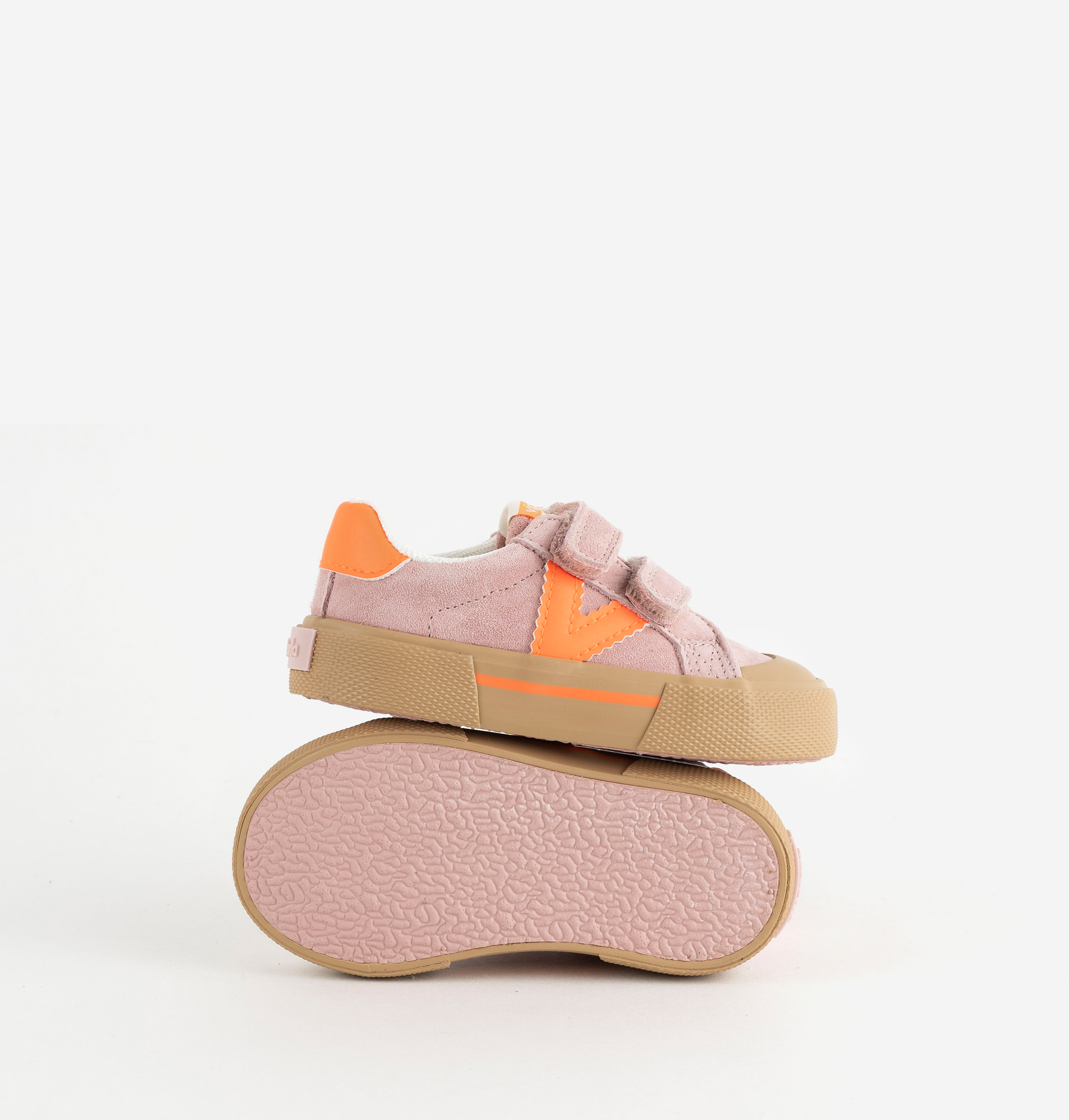 Zapatillas deportivas para niños fabricadas en serraje y piezas sintéticas. V del lateral y pieza trasera en colores a juego en contraste. Cierre mediante dos tiras adherentes, que facilitan el calce y aportan sujección. Suela de goma en color caramelo con refuerzo en la puntera para una mayor resistencia y durabilidad.