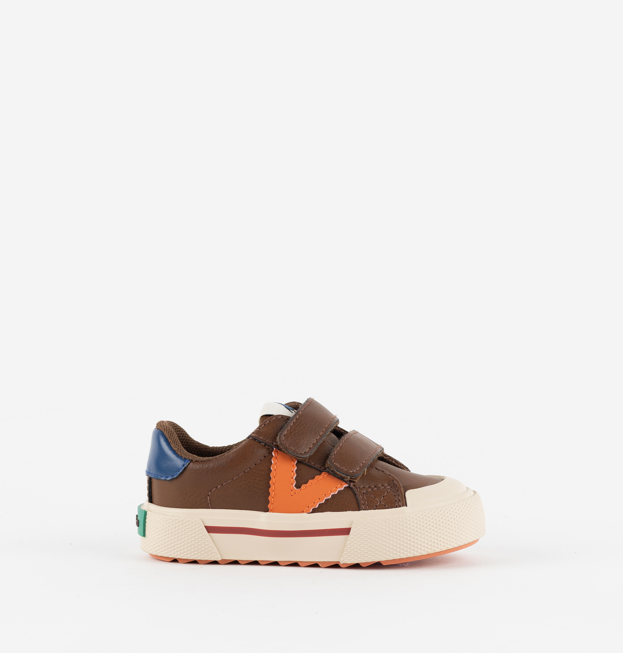 Zapatillas de corte bajo para niños fabricadas en efecto piel. Cierre mediante dos tiras adherentes, que facilitan el calce y fomentan su autonomía. Suela en sierra de goma con refuerzo en la puntera para una mayor resistencia y durabilidad.