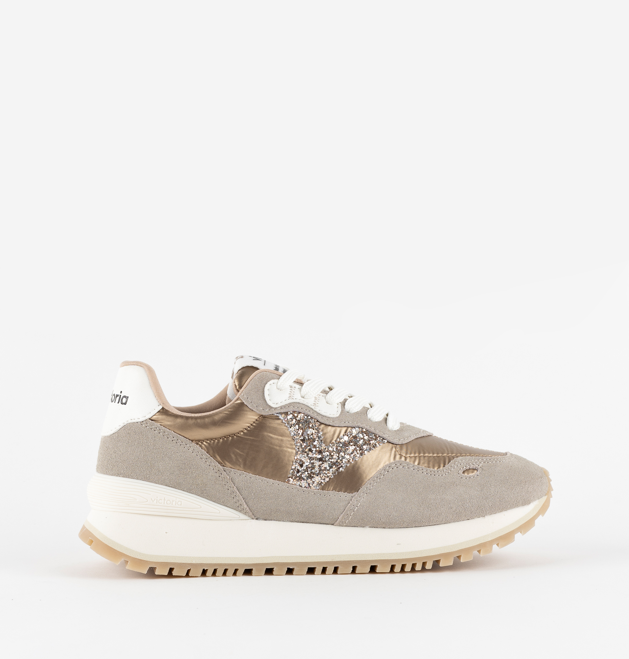 Sneakers para mujer confeccionadas en nylon con un acabado metalizado y un efecto acolchado y piezas de serraje al tono. V del lateral en glitter y pieza trasera en blanco con el logotipo de la marca. Su ligereza y carácter deportivo se ven realzados por detalles como la suela ancha y el estabilizador del talón.