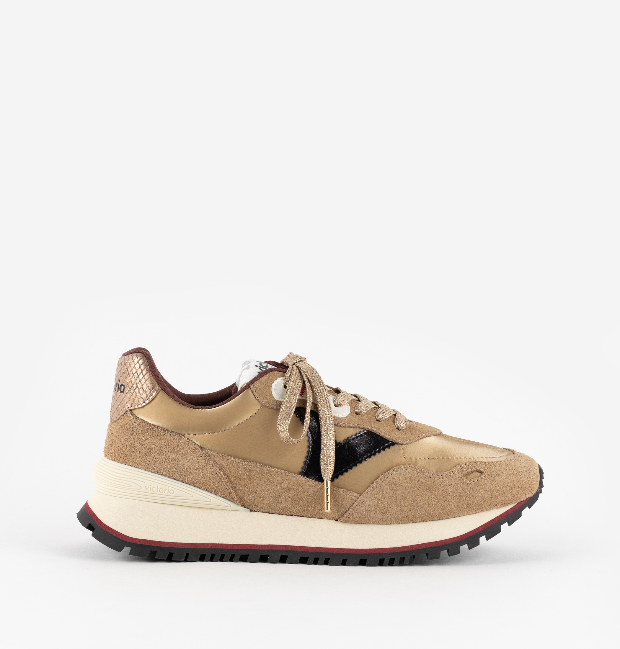 Sneakers para mujer confeccionadas en nylon con un acabado metalizado en combinación con piezas de serraje y detalles sintéticos. V del lateral y pieza trasera con el logotipo de la marca en efecto brillo metalizado. Cierre mediante cordones con fibras metalizadas. Su ligereza y carácter deportivo se ven realzados por detalles como la suela ancha, el estabilizador del talón y el patín negro en relieve antideslizante, que favorece un mayor agarre.