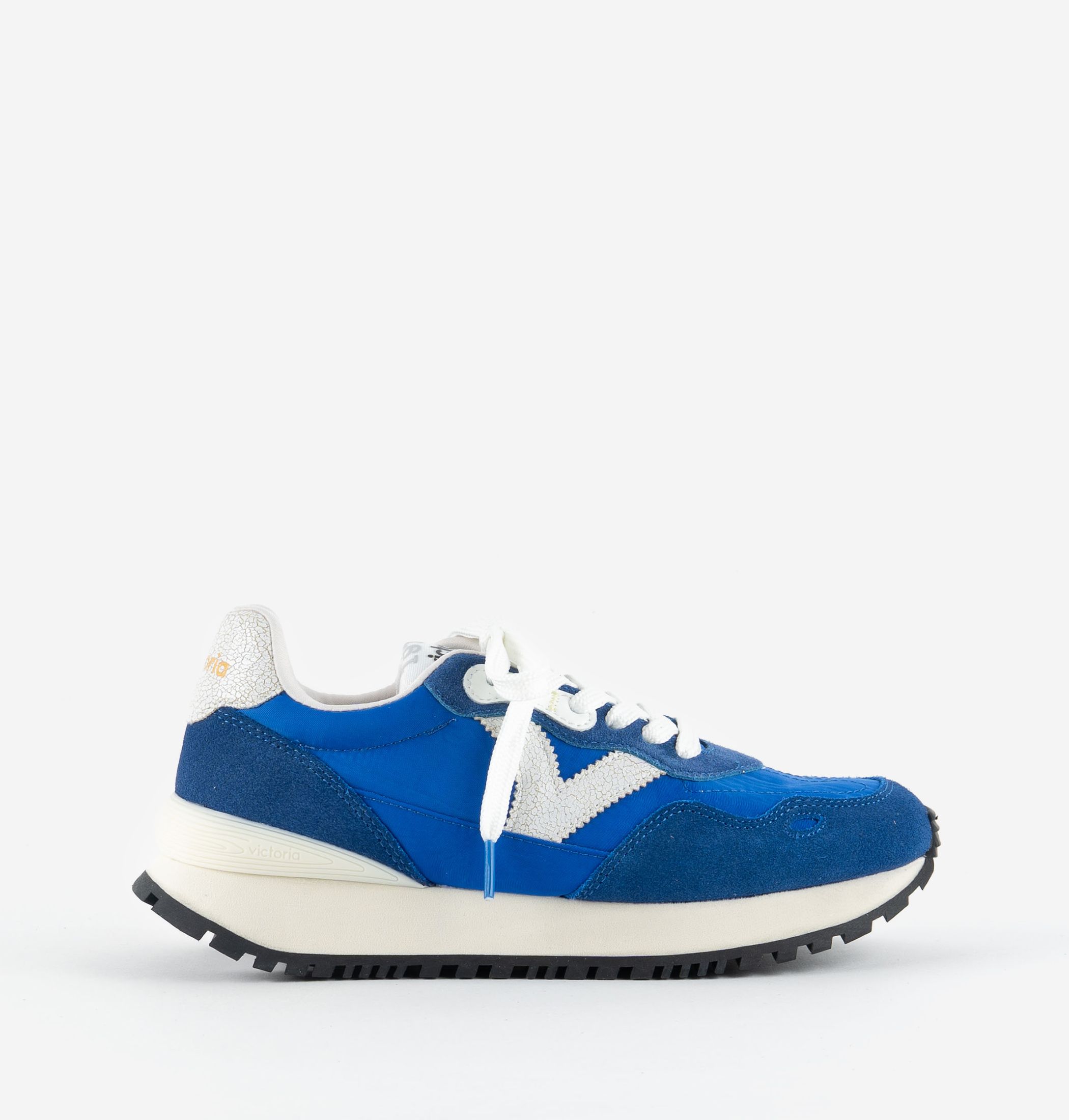 Sneakers para mujer fabricadas en nylon con piezas de serraje superpuestas al tono. V de victoria lateral y pieza trasera con el logotipo de la marca en efecto piel blanca craquelada en contraste. Cómoda suela de phylon con patín negro de TPR en relieve, y estabilizador en el talón.