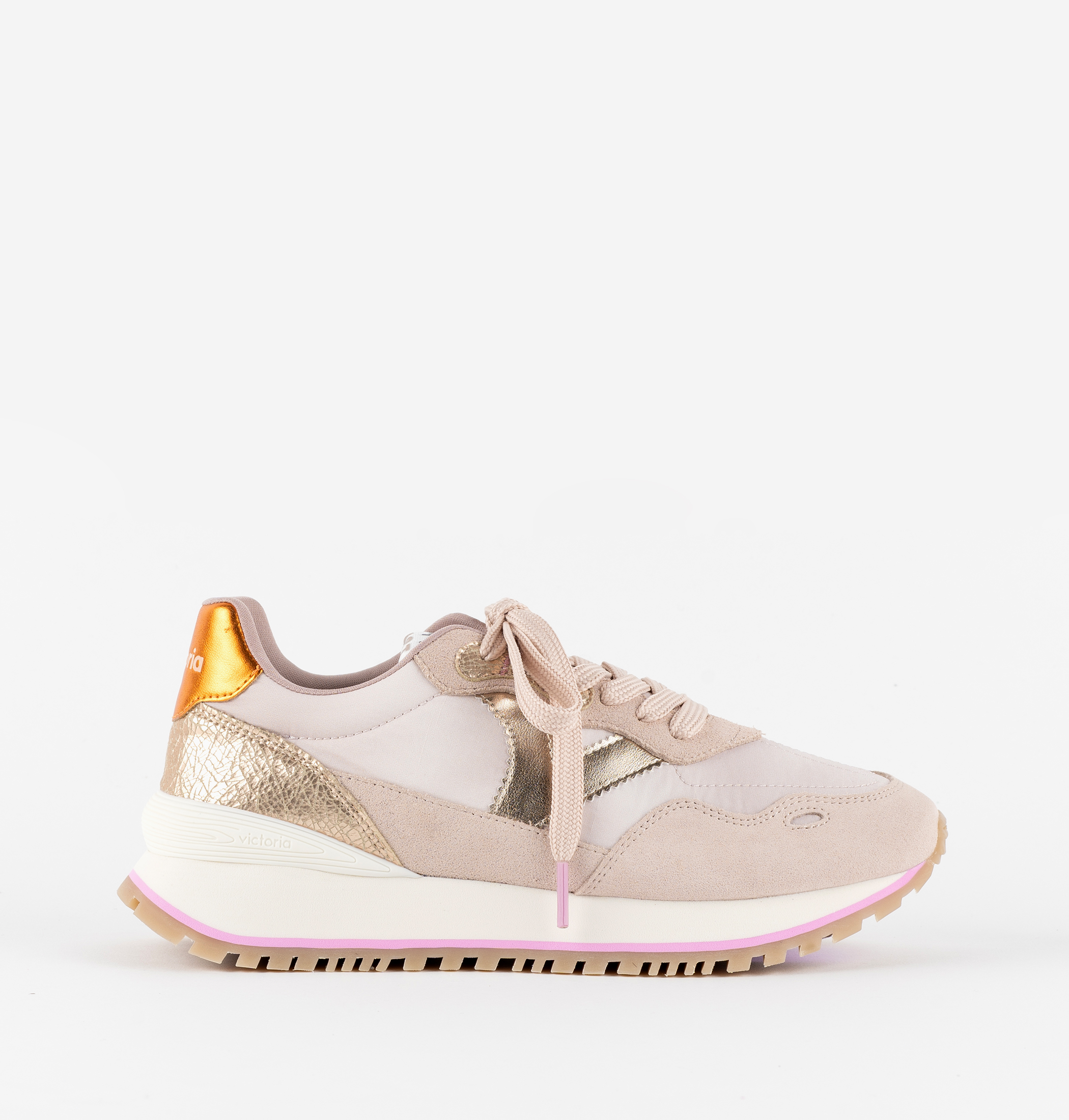 Sneakers para mujer fabricadas en nylon con piezas de serraje superpuestas al tono. V de victoria lateral y piezas traseras en tonos metalizados. Cierre mediante cordones al tono con cabetes de color. Cómoda suela bicolor de phylon con patín de TPR en relieve color caramelo, y estabilizador en el talón.