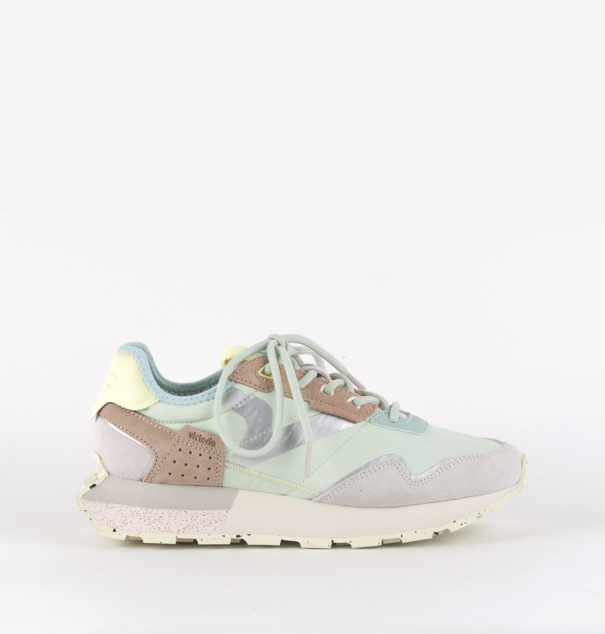 Sneakers para mujer fabricadas en nailon suave y piezas en serraje y sintéticas superpuestas. V retro en el lateral y detalles de cosidos en contraste. Lengüeta acolchada y tirador en relieve con el logotipo grabado. Suela E.V.A. con detalle de piedra pómez y patín de goma en relieve con estampado moteado ya que contiene materiales reciclados en su composición. Además, incluyen plantilla ergonómica que se adapta a la forma del pie y regala la sensación de comodidad.